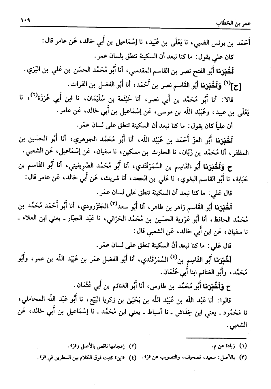 أحمد بن يونس الضبي نا يعلى بن عبيد نا إسماعيل بن أبي خالد عن عامر قال كان علي يقول ما كنا نبعد أن السكينة تنطق بلسان عمر أخبرنا أبو الفتح نصر بن القاسم المقدسي أنا أبو محمد الحسن بن علي بن البري ح (1) وأخبرنا أبو القاسم نصر بن أحمد أنا أبو الفضل بن الفرات قالا أنا أبو محمد بن أبي نصر أنا خيثمة بن سليمان نا ابن أبي غرزة (2) نا يعلى بن عبيد وعبيد الله بن موسى عن إسماعيل بن أبي خالد عن عامر أن عليا كان يقول ما كنا نبعد أن السكينة تنطق على لسان عمر أخبرنا أبو العز أحمد بن عبيد الله أنا أبو محمد الجوهري أنا أبو الحسين بن المظفر أنا محمد بن زبان نا الحارث بن مسكين نا سفيان عن إسماعيل عن الشعبي ح وأخبرنا أبو القاسم بن السمرقندي أنا أبو محمد الصريفيني أنا أبو القاسم بن حبابة نا أبو القاسم البغوي نا علي بن الجعد أنا شريك عن أبي خالد عن عامر قال قال علي ما كنا نبعد أن السكينة تنطق على لسان عمر أخبرنا أبو القاسم زاهر بن طاهر أنا أبو سعد (3) الجنزرودي أنا أبو أحمد محمد بن محمد الحافظ أنا أبو عروبة الحسين بن محمد الحراني نا عبد الجبار يعني ابن العلاء نا سفيان عن ابن أبي خالد عن الشعبي قال قال علي ما كنا نبعد أن السكينة تنطق على لسان عمر أخبرنا أبو القاسم بن السمرقندي أنا أبو الفضل عمر بن عبيد الله بن عمر وأبو محمد وأبو الغنائم ابنا أبي عثمان ح وأخبرنا أبو محمد بن طاوس أنا أبو الغنائم بن أبي عثمان قالوا أنا عبد الله بن عبيد الله بن يحيى بن زكريا البيع نا أبو عبد الله المحاملي نا محمود يعني ابن خداش نا أسباط يعني ابن محمد نا إسماعيل بن أبي خالد عن الشعبي
