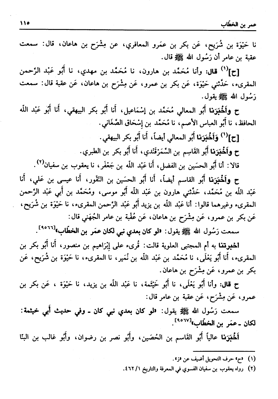 نا حيوة بن شريح عن بكر بن عمرو المعافري عن مشرح بن هاعان قال سمعت عقبة بن عامر أن رسول الله (صلى الله عليه وسلم) قال ح (1) قال وأنا محمد بن هارون نا محمد بن مهدي نا أبو عبد الرحمن المقرئ حدثني حيوة عن بكر بن عمرو عن مشرح بن هاعان عن عقبة قال سمعت رسول الله (صلى الله عليه وسلم) يقول ح وأخبرنا أبو المعالي محمد بن إسماعيل أنا أبو بكر البيهقي أنا أبو عبد الله الحافظ نا أبو العباس الأصم نا محمد بن إسحاق الصغاني ح (1) وأخبرنا أبو المعالي أيضا أنا أبو بكر البيهقي ح وأخبرنا أبو القاسم بن السمرقندي أنا أبو بكر بن الطبري قالا أنا أبو الحسين بن الفضل أنا عبد الله بن جعفر نا يعقوب بن سفيان (2) ح وأخبرنا أبو القاسم أيضا أنا أبو الحسين بن النقور أنا عيسى بن علي أنا عبد الله بن محمد حدثني هارون بن عبد الله أبو موسى ومحمد بن أبي عبد الرحمن المقرئ وغيرهما قالوا أنا عبد الله بن يزيد أبو عبد الرحمن المقرئ نا حيوة بن شريح عن بكر بن عمرو عن مشرح بن هاعان عن عقبة بن عامر الجهني قال سمعت رسول الله (صلى الله عليه وسلم) يقول لو كان بعدي نبي لكان عمر بن الخطاب