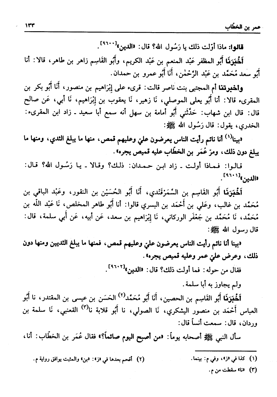 [9600] أخبرنا أبو المظفر عبد المنعم بن عبد الكرمي وأبو القاسم زاهر بن طاهر قالا أنا أبو سعد محمد بن عبد الرحمن أنا أبو عمرو بن حمدان وأخبرتنا أم المجتبى بنت ناصر قالت قرئ على إبراهيم بن منصور أنا أبو بكر بن المقرئ قالا أنا أبو يعلى الموصلي نا زهير نا يعقوب بن إبراهيم نا أبي عن صالح قال قال ابن شهاب حدثني أبو أمامة بن سهل أنه سمع أبا سعيد زاد ابن المقرئ الخدري يقول قال رسول الله (صلى الله عليه وسلم) بينا (1) أنا نائم رأيت الناس يعرضون علي وعليهم قمص منا ما يبلغ الثدي ومنها ما يبلغ دون ذلك ومر عمر بن الخطاب عليه قميص يجره قالوا فماذا أولت زاد ابن حمدان ذلك وقالا يا رسول الله قال الدين