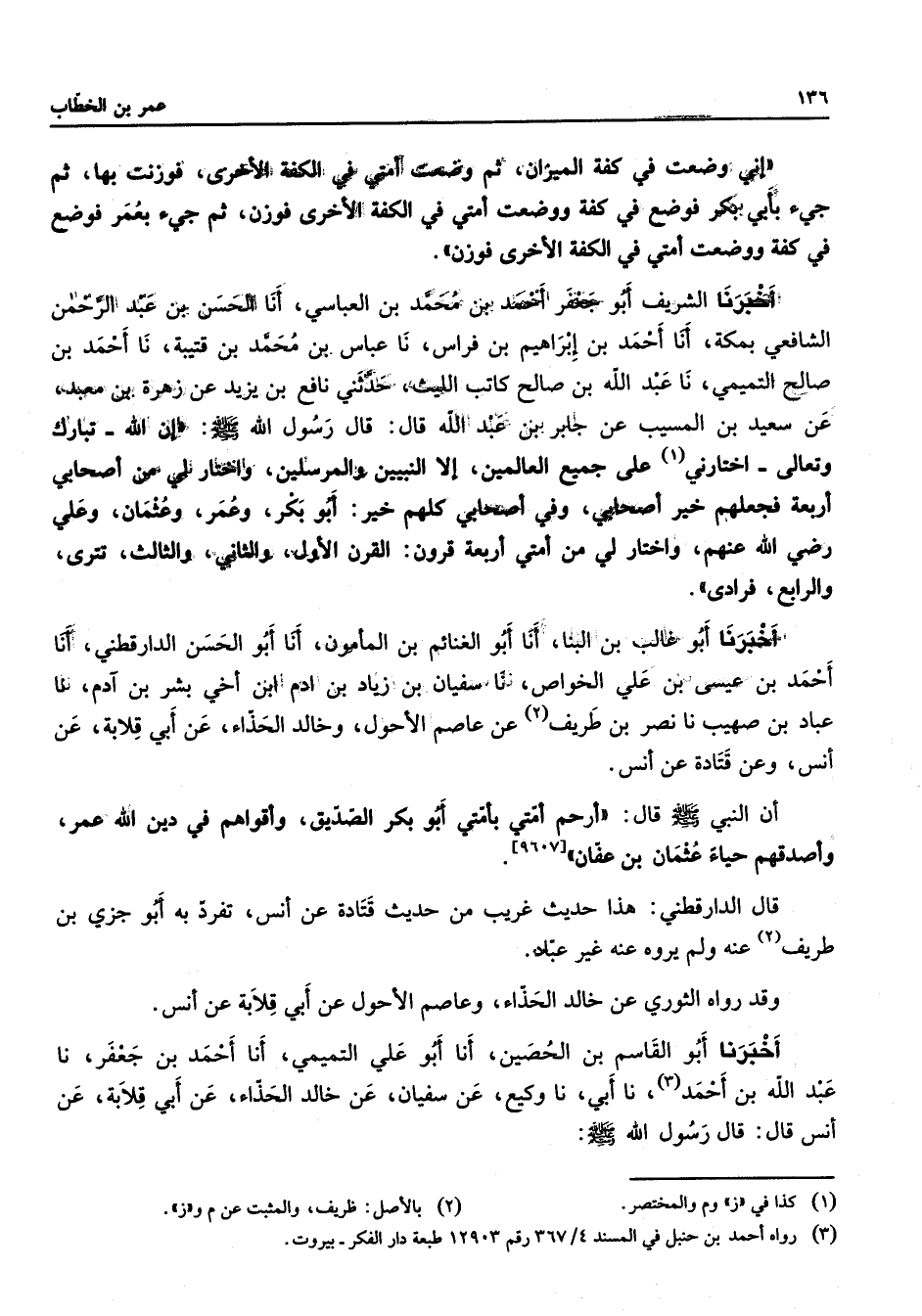 إني وضعت في كفة الميزان ثم وضعت أمتي في الكفة الأخرى فوزنت بها ثم جئ بأبي بكر فوضع في كفة ووضعت أمتي في الكفة الأخرى فوزن ثم جئ بعمر فوضع في كفة ووضعت أمتي في الكفة الأخرى فوزن أخبرنا الشريف أبو جعفر احمد بن محمد بن العباسي أنا الحسن بن عبد الرحمن الشافعي بمكة أنا أحمد بن إبراهيم بن فراس نا عباس بن محمد بن قتيبة نا أحمد بن صالح التميمي نا عبد الله بن صالح كاتب الليث حدثني نافع بن يزيد عن زهرة بن معبد عن سعيد بن المسيب عن جابر بن عبد الله قال قال رسول الله (صلى الله عليه وسلم) إن الله تبارك وتعالى اختارني (1) على جميع العالمين إلا النبيين والمرسلين واختار لي من أصحابي أربعة فجعلهم خير أصحابي وفي أصحابي كلهم خير أبو بكر وعمر وعثمان وعلي Bهم واختار لي من أمتي أربعة قرون القرن الأول والثاني والثالث تترى والرابع فرادى أخبرنا أبو غالب بن البنا أنا أبو الغنائم بن المأمون أنا أبو الحسن الدارقطني أنا أحمد بن عيسى بن علي الخواص نا سفيان بن زياد بن ادم ابن أخي بشر بن آدم نا عباد بن صهيب نا نصر بن طريف (2) عن عاصم الأحول وخالد الحذاء عن أبي قلابة عن أنس وعن قتادة عن أنس أن النبي (صلى الله عليه وسلم) قال أرحم أمتي بأمتي أبو بكر الصديق وأقواهم في دين الله عمر