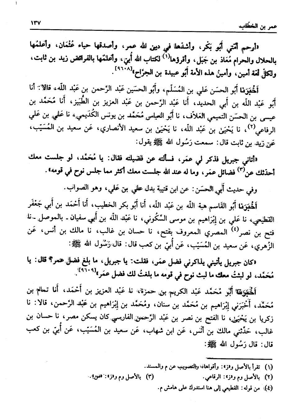[9608] أخبرنا أبو الحسن علي بن المسلم وأبو الحسين عبد الرحمن بن عبد الله قالا أنا أبو عبد الله بن أبي الحديد أنا عبد الرحمن بن عبد العزيز بن الطبيز أنا محمد بن عيسى بن الحسن التميمي العلاف نا أبو العباس محمد بن يونس الكديمي نا علي بن علي الرفاعي (2) نا يحيى بن عبد الله نا يحيى بن سعيد الأنصاري عن سعيد بن المسيب عن زيد بن ثابت قال سمعت رسول الله (صلى الله عليه وسلم) يقول أتاني جبريل فذكر لي عمر فسألته عن فضيلته فقال يا محمد لو جلست معك أحدثك عن (3) فضائل عمر وما له عند الله جلست معك أكثر مما جلس نوح في قومه وفي حديث أبي الحسن عن ابن قتيبة بدل علي بن علي وهو الصواب أخبرنا أبو القاسم هبة الله بن عبد الله أنا أبو بكر الخطيب أنا أحمد بن أبي جعفر القطيعي نا علي بن إبراهيم بن موسى السكوني نا عبد الله بن أبي سفيان بالموصل نا فتح بن نصر (4) المصري المعروف بفتح نا حسان بن غالب نا مالك بن أنس عن الزهري عن سعيد بن المسيب عن أبي بن كعب قال قال رسول الله (صلى الله عليه وسلم) (كان جبريل يأتني يذاكرني فضل عمر فقلت يا جبريل ما بلغ فضل عمر قال يا محمد لو لبثت معك ما لبث نوح في قومه ما بلغت لك فضل عمر
