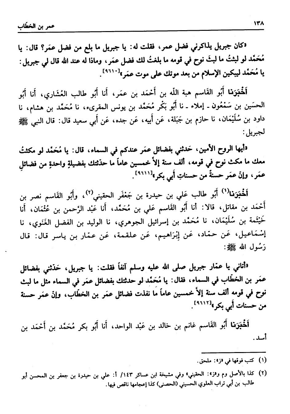 [9611] أخبرنا (1) أبو طالب علي بن حيدرة بن جعفر الحقيني (2) وأبو القاسم نصر بن أحمد بن مقاتل قالا أنا أبو القاسم علي بن محمد أنا عبد الرحمن بن عثمان أنا خيثمة بن سليمان نا محمد بن إسرائيل الجوهري نا الوليد بن الفضل الغنوي نا إسماعيل عن حماد عن إبراهيم عن علقمة عن عمار بن ياسر قال قال رسول الله (صلى الله عليه وسلم) أتاني يا عمار جبريل صلى الله عليه وسلم آنفا فقلت يا جبريل حدثني بفضائل عمر بن الخطاب في السماء فقال يا محمد لو حدثتك بفضائل عمر في السماء مثل ما لبث نوح في قومه ألف سنة إلا خمسين عاما ما نفذت فضائل عمر بن الخطاب وإن عمر حسنة من حسنات أبي بكر