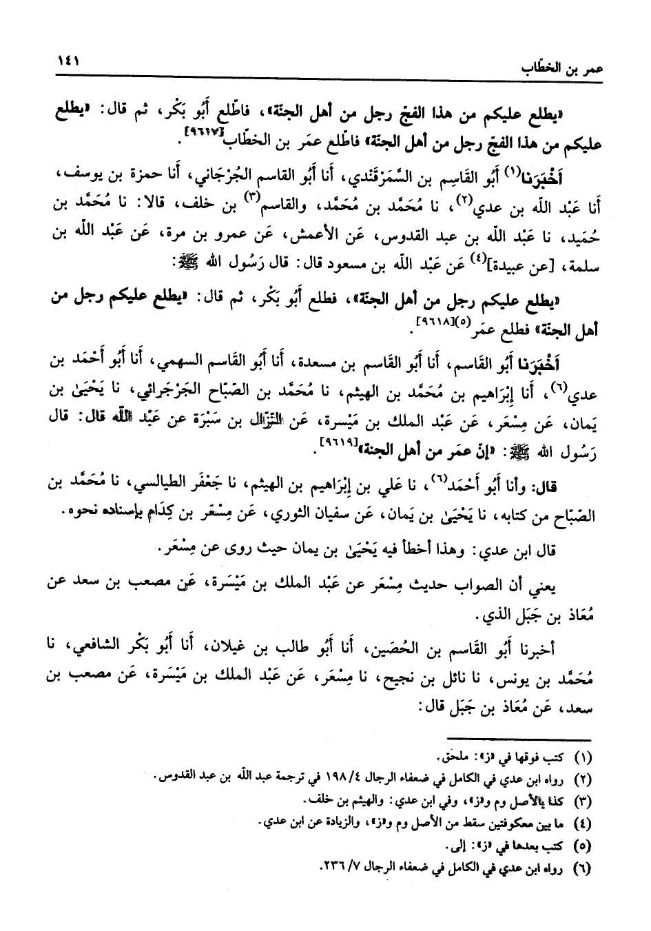 [9618] أخبرنا أبو القاسم أنا أبو القاسم بن مسعدة أنا أبو القاسم السهمي أنا أبو أحمد بن عدي (6) أنا إبراهيم بن محمد بن الهيثم نا محمد بن الصباح الجرجرائي نا يحيى بن يمان عن مسعر عن عبد الملك بن ميسرة عن النزال بن سبرة عن عبد الله قال قال رسول الله (صلى الله عليه وسلم) إن عمر من أهل الجنة