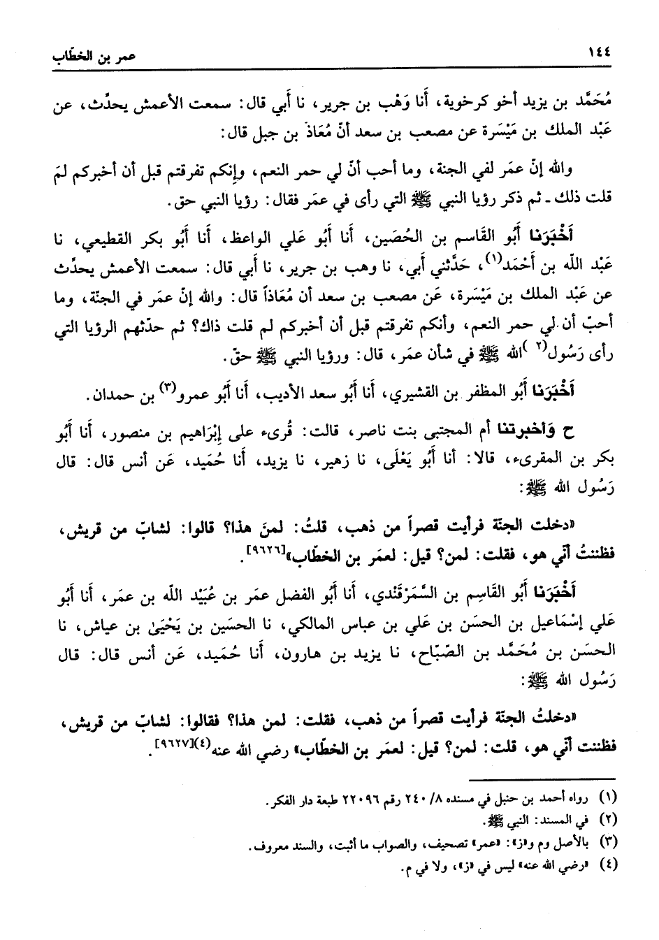 محمد بن يزيد أخو كرخوية أنا وهب بن جرير نا أبي قال سمعت الأعمش يحدث عن عبد الملك بن ميسرة عن مصعب بن سعد أن معاذ بن جبل قال والله إن عمر لفي الجنة وما أحب أن لي حمر النعم وإنكم تفرقتم قبل أن أخبركم لم قلت ذلك ثم ذكر رؤيا النبي (صلى الله عليه وسلم) التي رأى في عمر فقال رؤيا النبي حق أخبرنا أبو القاسم بن الحصين أنا أبو علي الواعظ أنا أبو بكر القطيعي نا عبد الله بن أحمد (1) حدثني أبي نا وهب بن جرير نا أبي قال سمعت الأعمش يحدث عن عبد الملك بن ميسرة عن مصعب بن سعد أن معاذا قال والله إن عمر في الجنة وما أحب أن لي حمر النعم وأنكم تفرقتم قبل أن أخبركم لم قلت ذاك ثم حدثهم الرؤيا التي رأى رسول (2) الله (صلى الله عليه وسلم) في شأن عمر قال ورؤيا النبي (صلى الله عليه وسلم) حق أخبرنا أبو المظفر بن القشيري أنا أبو سعد الأديب أنا أبو عمرو (3) بن حمدان ح وأخبرتنا أم المجتبى بنت ناصر قالت قرئ على إبراهيم بن منصور أنا أبو بكر بن المقرئ قالا أنا أبو يعلى نا زهير نا يزيد أنا حميد عن أنس قال قال رسول الله (صلى الله عليه وسلم) دخلت الجنة فرأيت قصرا من ذهب قلت لمن هذا قالوا لشاب من قريش فظننت أني هو فقلت لمن قيل لعمر بن الخطاب