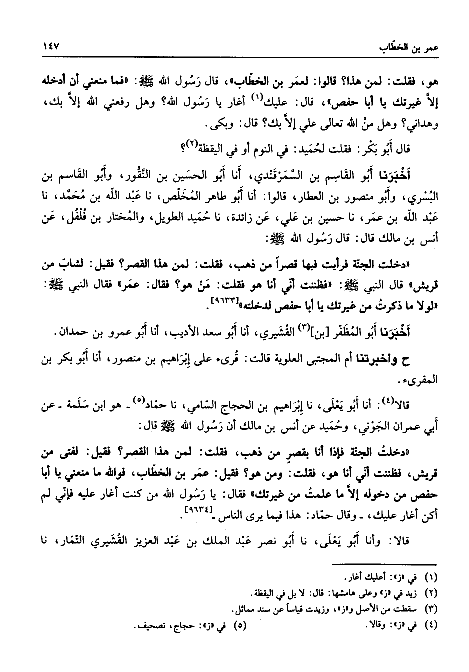 [9633] أخبرنا أبو المظفر بن (3) القشيري أنا أبو سعد الأديب أنا أبو عمرو بن حمدان ح وأخبرتنا أم المجتبى العلوية قالت قرئ على إبراهيم بن منصور أنا أبو بكر بن المقرئ قالا (4) أنا أبو يعلى نا إبراهيم بن الحجاج السامي نا حماد (5) هو ابن سلمة عن أبي عمران الجوني وحميد عن أنس بن مالك أن رسول الله (صلى الله عليه وسلم) قال دخلت الجنة فإذا أنا بقصر من ذهب فقلت لمن هذا القصر فقيل لفتى من قريش فظننت أني أنا هو فقلت ومن هو فقيل عمر بن الخطاب فوالله ما منعني يا أبا حفص من دخوله إلا ما علمت من غيرتك فقال يا رسول الله من كنت أغار عليه فإني لم أكن أغار عليك وقال حماد هذا فيما يرى الناس