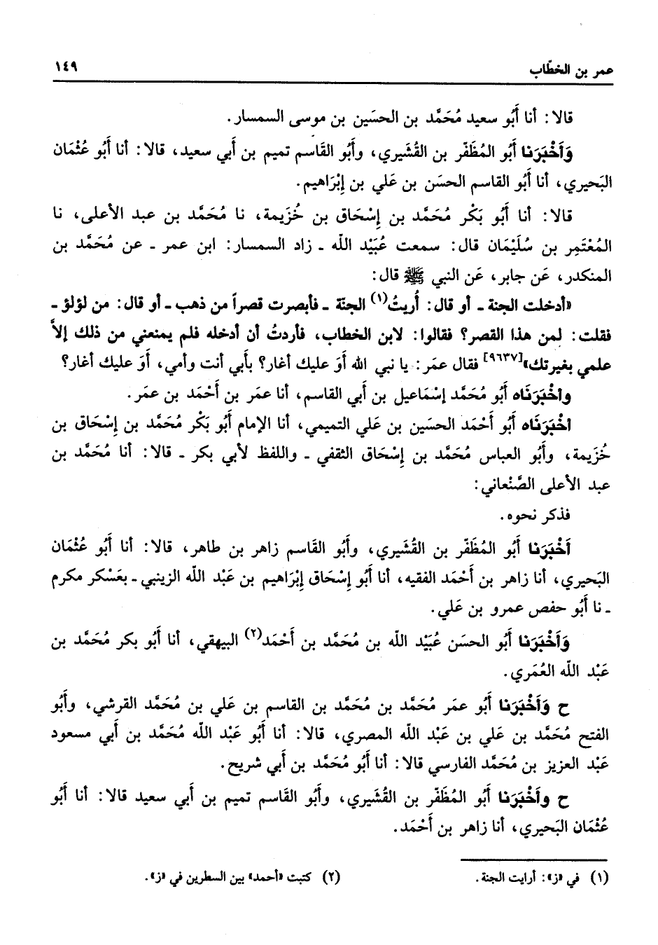 قالا أنا أبو سعيد محمد بن الحسين بن موسى السمسار وأخبرنا أبو المظفر بن القشيري وأبو القاسم تميم بن أبي سعيد قالا أنا أبو عثمان البحيري أنا أبو القاسم الحسن بن علي بن إبراهيم قالا أنا أبو بكر محمد بن إسحاق بن خزيمة نا محمد بن عبد الأعلى نا المعتمر بن سليمان قال سمعت عبيد الله زاد السمسار ابن عمر عن محمد بن المنكدر عن جابر عن النبي (صلى الله عليه وسلم) قال أدخلت الجنة أو قال أريت (1) الجنة فأبصرت قصرا من ذهب أو قال من لؤلؤ فقلت لمن هذا القصر فقالوا لابن الخطاب فأردت أن أدخله فلم يمنعني من ذلك إلا علمي بغيرتك