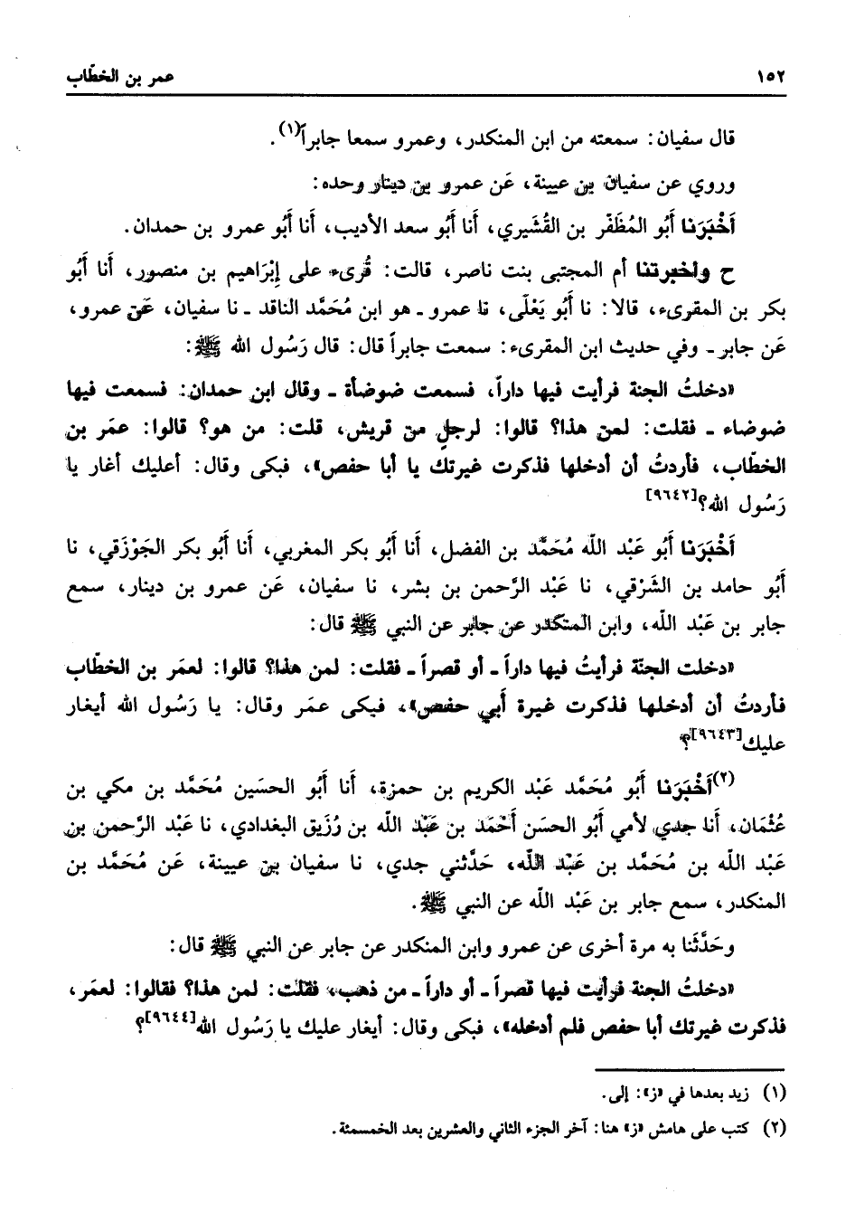 [9643] (2) أخبرنا أبو محمد عبد الكريم بن حمزة أنا أبو الحسين محمد بن مكي بن عثمان أنا جدي لأمي أبو الحسن أحمد بن عبد الله بن رزيق البغدادي نا عبد الرحمن بن عبد الله بن محمد بن عبد الله حدثني جدي نا سفيان بن عيينة عن محمد بن المنكدر سمع جابر بن عبد الله عن النبي (صلى الله عليه وسلم) وحدثنا به مرة أخرى عن عمرو وابن المنكدر عن جابر عن النبي (صلى الله عليه وسلم) قال دخلت الجنة فرأيت فيها قصرا أو دارا من ذهب فقلت لمن هذا فقالوا لعمر فذكرت غيرتك أبا حفص فلم أدخله فبكى وقال أيغار عليك يا رسول الله