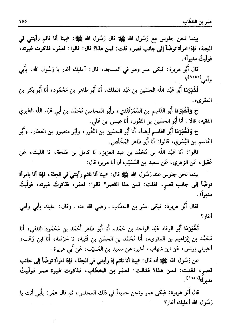 [9650] أخبرنا أبو عبد الله الحسين بن عبد الملك أنا أبو طاهر بن محمود أنا أبو بكر بن المقرئ وأخبرنا أبو القاسم بن السمرقندي وأبو المحاسن محمد بن أبي عبد الله الطبري الفقيه قالا أنا أبو الحسين بن النقور أنا عيسى بن علي ح وأخبرنا أبو القاسم أيضا أنا أبو الحسين بن النقور وأبو منصور بن العطار وأبو القاسم بن البسري قالوا أنا أبو طاهر المخلص قالوا أنا عبد الله بن محمد بن عبد العزيز نا كامل بن طلحة نا الليث عن عقيل عن الزهري عن سعيد بن المسيب أن أبا هريرة قال بينما نحن جلوس عند رسول الله (صلى الله عليه وسلم) قال بينا أنا نائم رأيتني في الجنة فإذا أنا بامرأة توضأ إلى جانب قصر فقلت لمن هذا القصر قالوا لعمر فذكرت غيرته فوليت مدبرا فقال أبو هريرة فبكى عمر بن الخطاب Bهـ وقال عليك بأبي وأمي أغار؟ أخبرنا أبو الوفاء عبد الواحد بن حمد أنا أبو طاهر أحمد بن محمود الثقفي أنا محمد بن إبراهيم بن المقرئ أنا محمد بن الحسن بن قتيبة نا حرملة أنا ابن وهب أخبرني يونس عن ابن شهاب أخبره عن سعيد بن المسيب عن أبي هريرة عن رسول الله (صلى الله عليه وسلم) أنه قال بينا أنا نائم إذ رأيتني في الجنة فإذا امرأة توضأ إلى جانب قصر فقلت لمن هذا فقالت لعمر بن الخطاب فذكرت غيرة عمر فوليت مدبرا