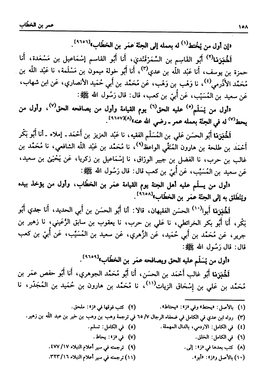 [9658] أخبرنا أبوا (10) الحسن الفقيهان قالا أنا أبو الحسن بن أبي الحديد أنا جدي أبو بكر أنا أبو بكر الخرائطي نا علي بن حرب نا يعقوب بن سابق الرعيني نا زهير بن جرير عن محمد بن أبي حميد عن الزهري عن سعيد بن المسيب عن أبي بن كعب قال قال رسول الله (صلى الله عليه وسلم) أول من يسلم عليه الحق ويصافحه عمر بن الخطاب