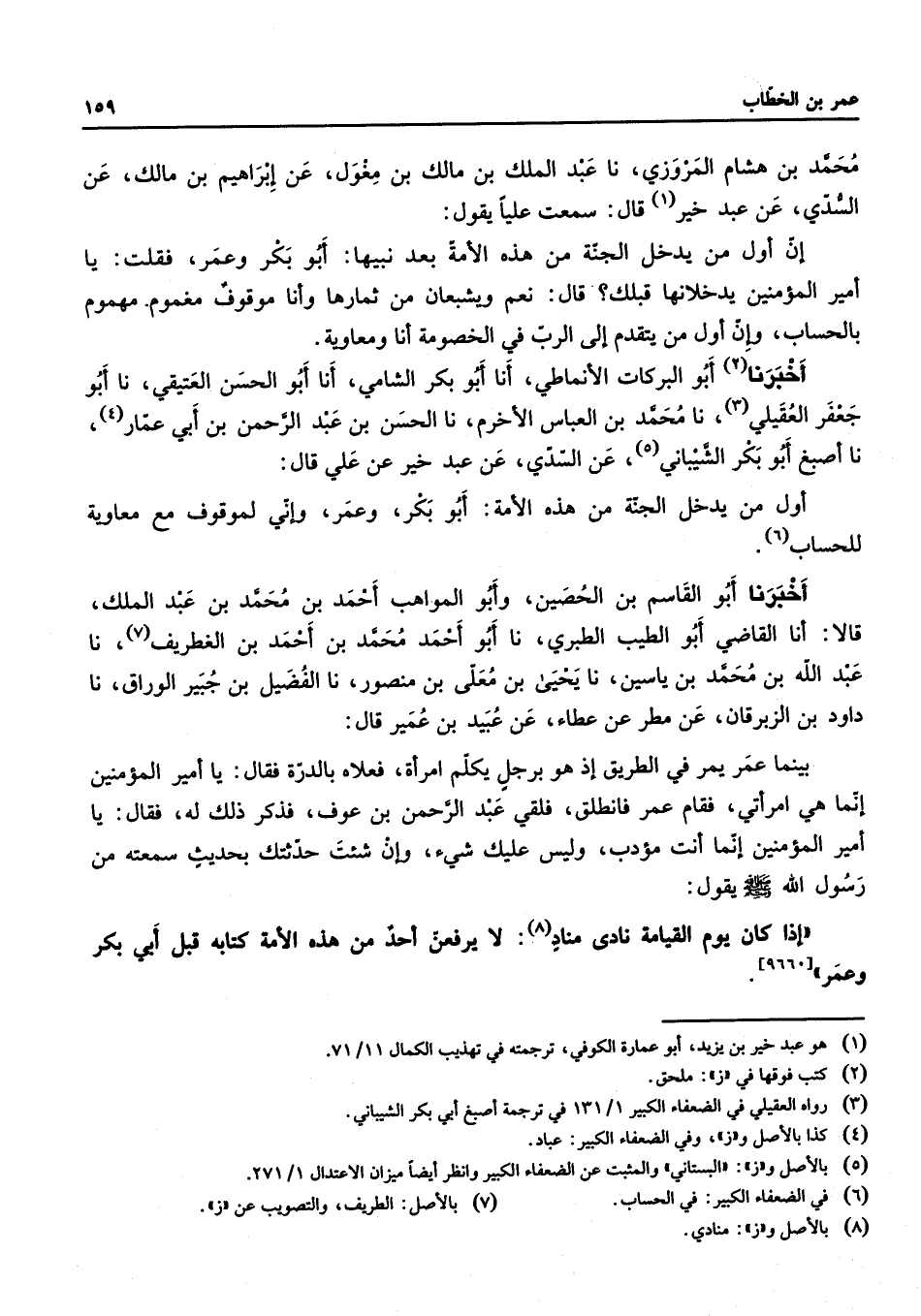 محمد بن هشام المروزي نا عبد الملك بن مالك بن مغول عن إبراهيم بن مالك عن السدي عن عبد خير (1) قال سمعت عليا يقول إن أول من يدخل الجنة من هذه الأمة بعد نبيها أبو بكر وعمر فقلت يا أمير المؤمنين يدخلانها قبلك قال نعم ويشبعان من ثمارها وأنا موقوف مغموم مهموم بالحساب وإن أول من يتقدم إلى الرب في الخصومة أنا ومعاوية أخبرنا (2) أبو البركات الأنماطي أنا أبو بكر الشامي أنا أبو الحسن العتيقي نا أبو جعفر العقيلي (3) نا محمد بن العباس الأخرم نا الحسن بن عبد الرحمن بن أبي عمار (4) نا أصبغ أبو بكر الشيباني (5) عن السدي عن عبد خير عن علي قال أول من يدخل الجنة من هذه الأمة أبو بكر وعمر وإني لموقوف مع معاوية للحساب (6) أخبرنا أبو القاسم بن الحصين وأبو المواهب أحمد بن محمد بن عبد الملك قالا أنا القاضي أبو الطيب الطبري نا أبو أحمد محمد بن أحمد بن الغطريف (7) نا عبد الله بن محمد بن ياسين نا يحيى بن معلى بن منصور نا الفضيل بن جبير الوراق نا داود بن الزبرقان عن مطر عن عطاء عن عبيد بن عمير قال بينما عمر يمر في الطريق إذ هو برجل يكلم امرأة فعلاه بالدرة فقال يا أمير المؤمنين إنما هي امرأتي فقام عمر فانطلق فلقي عبد الرحمن بن عوف فذكر ذلك له فقال يا أمير المؤمنين إنما أنت مؤدب وليس عليك شئ وإن شئت حدثتك بحديث سمعته من رسول الله (صلى الله عليه وسلم) يقول إذا كان يوم القيامة نادى مناد (8) لا يرفعن أحد من هذه الأمة كتابه قبل أبي بكر وعمر
