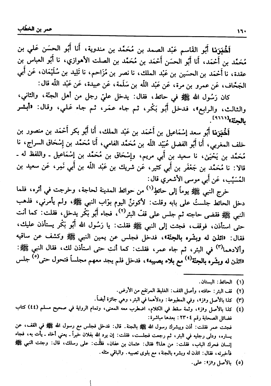 [9661] أخبرنا أبو سعد إسماعيل بن أحمد بن عبد الملك أنا أبو بكر أحمد بن منصور بن خلف المغربي أنا أبو الفضل عبيد الله بن محمد الفامي أنا محمد بن إسحاق السراج نا محمد بن يحيى نا سعيد بن أبي مريم وإسحاق بن محمد بن إسماعيل واللفظ له قالا نا محمد بن جعفر بن أبي كثير عن شريك بن عبد الله بن أبي نمر عن سعيد بن المسيب عن أبي موسى الأشعري قال خرج النبي (صلى الله عليه وسلم) يوما إلى حائط (1) من نحوائط المدينة لحاجة وخرجت في أثره فلما دخل الحائط جلست على بابه وقلت لأكونن اليوم بواب النبي (صلى الله عليه وسلم) ولم يأمرني فذهب النبي (صلى الله عليه وسلم) فقضى حاجته ثم جلس على قف البئر (2) فجاء أبو بكر يدخل فقلت كما أنت حتى استأذن فوقف فجئت إلى النبي (صلى الله عليه وسلم) فقلت يا رسول الله أبو بكر يستأذن عليك فقال ائذن له وبشره بالجنة فدخل فجلس عن يمين النبي (صلى الله عليه وسلم) وكشف عن ساقيه وألادهما (3) في البئر ثم جاء عمر فقلت كما أنت حتى استأذن لك فقال النبي (صلى الله عليه وسلم) ائذن له وبشره بالجنة (4) مع بلاء يصيبه فدخل فلم يجد معهم مجلسا فتحول حتى (5) جلس