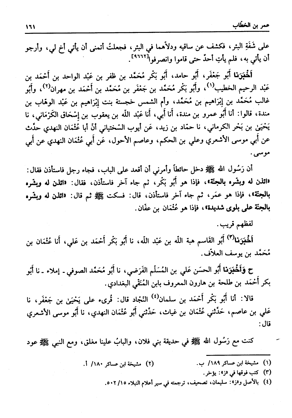 [9662] أخبرنا أبو جعفر أبو حامد أبو بكر محمد بن ظفر بن عبد الواحد بن أحمد بن عبد الرحيم الخطيب (1) وأبو بكر محمد بن جعفر بن محمد بن أحمد بن مهران (2) وأبو غالب محمد بن إبراهيم بن محمد وأم الشمس خجستة بنت إبراهيم بن عبد الوهاب بن مندة قالوا أنا أبو عمرو بن مندة أنا أبي أنا عبد الله بن يعقوب بن إسحاق الكرماني نا يحيى بن بحر الكرماني نا حماد بن زيد عن أيوب السختياني أن أبا عثمان النهدي حدث عن أبي موسى الأشعري وعلي بن الحكم وعاصم الأحول عن أبي عثمان النهدي عن أبي موسى أن رسول الله (صلى الله عليه وسلم) دخل حائطا وأمرني أن أقعد على الباب فجاء رجل فاستأذن فقال ائذن له وبشره بالجنة فإذا هو أبو بكر ثم جاء آخر فاستأذن فقال ائذن له وبشره بالجنة فإذا هو عمر ثم جاء آخر فاستأذن قال فسكت (صلى الله عليه وسلم) ثم قال ائذن له وبشره بالجنة على بلوى شديدة فإذا هو عثمان بن عفان لفظهم قريب أخبرنا (3) أبو القاسم هبة الله بن عبد الله نا أبو بكر أحمد بن علي أنا عثمان بن محمد بن يوسف العلاف ح وأخبرنا أبو الحسن علي بن المسلم الفرضي نا أبو محمد الصوفي إملاء نا أبو بكر أحمد بن طلحة بن هارون المعروف بابن المنقي البغدادي قالا أنا أبو بكر أحمد بن سلمان (4) النجاد قال قرئ على يحيى بن جعفر نا علي بن عاصم حدثني عثمان بن غياث حدثني أبو عثمان النهدي نا أبو موسى الأشعري قال كنت مع رسول الله (صلى الله عليه وسلم) في حديقة بني فلان والباب علينا مغلق ومع النبي (صلى الله عليه وسلم) عود