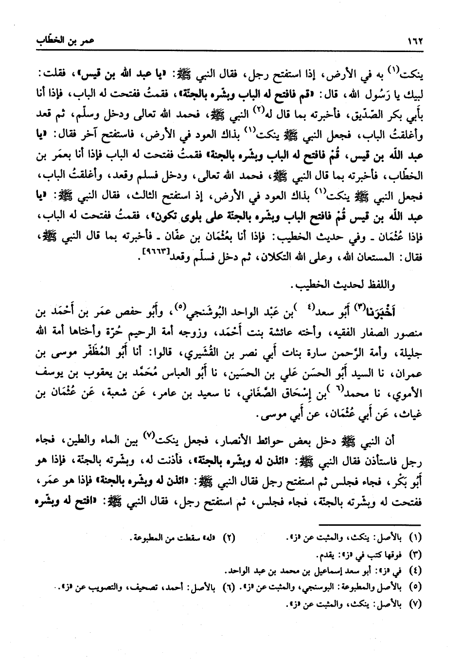 [9663] واللفظ لحديث الخطيب أخبرنا (3) أبو سعد (4) بن عبد الواحد البوشنجي (5) وأبو حفص عمر بن أحمد بن منصور الصفار الفقيه وأخته عائشة بنت أحمد وزوجه أمة الرحيم حرة وأختاها أمة الله جليلة وأمة الرحمن سارة بنات أبي نصر بن القشيري قالوا أنا أبو المظفر موسى بن عمران نا السيد أبو الحسن علي بن الحسين نا أبو العباس محمد بن يعقوب بن يوسف الأموي نا محمد (6) بن إسحاق الصغاني نا سعيد بن عامر عن شعبة عن عثمان بن غياث عن أبي عثمان عن أبي موسى أن النبي (صلى الله عليه وسلم) دخل بعض حوائط الأنصار فجعل ينكت (7) بين الماء والطين فجاء رجل فاستأذن فقال النبي (صلى الله عليه وسلم) ائذن له وبشره بالجنة فأذنت له وبشرته بالجنة فإذا هو أبو بكر فجاء فجلس ثم استفتح رجل فقال النبي (صلى الله عليه وسلم) ائذن له وبشره بالجنة فإذا هو عمر ففتحت له وبشرته بالجنة فجاء فجلس ثم استفتح رجل فقال النبي (صلى الله عليه وسلم) افتح له وبشره