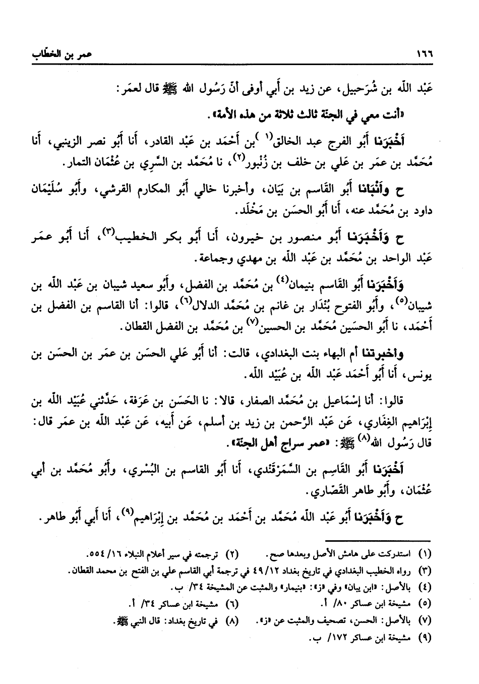 عبد الله بن شرحبيل عن زيد بن أبي أوفى أن رسول الله (صلى الله عليه وسلم) قال لعمر أنت معي في الجنة ثالث ثلاثة من هذه الأمة أخبرنا أبو الفرج عبد الخالق (1) بن أحمد بن عبد القادر أنا أبو نصر الزينبي أنا محمد بن عمر بن علي بن خلف بن زنبور (2) نا محمد بن السري بن عثمان التمار ح وأنبأنا أبو القاسم بن بيان وأخبرنا خالي أبو المكارم القرشي وأبو سليمان داود بن محمد عنه أنا أبو الحسن بن مخلد ح وأخبرنا أبو منصور بن خيرون أنا أبو بكر الخطيب (3) أنا أبو عمر عبد الواحد بن محمد بن عبد الله بن مهدي وجماعة وأخبرنا أبو القاسم بنيمان (4) بن محمد بن الفضل وأبو سعيد شيبان بن عبد الله بن شيبان (5) وأبو الفتوح بندار بن غانم بن محمد الدلال (6) قالوا أنا القاسم بن الفضل بن أحمد نا أبو الحسين محمد بن الحسين (7) بن محمد بن الفضل القطان وأخبرتنا أم البهاء بنت البغدادي قالت أنا أبو علي الحسن بن عمر بن الحسن بن يونس أنا أبو أحمد عبد الله بن عبيد الله قالوا أنا إسماعيل بن محمد الصفار قالا نا الحسن بن عرفة حدثني عبيد الله بن إبراهيم الغفاري عن عبد الرحمن بن زيد بن أسلم عن أبيه عن عبد الله بن عمر قال قال رسول الله (8) (صلى الله عليه وسلم) عمر سراج أهل الجنة أخبرنا أبو القاسم بن السمرقندي أنا أبو القاسم بن البسري وأبو محمد بن أبي عثمان وأبو طاهر القصاري ح وأخبرنا أبو عبد الله محمد بن أحمد بن محمد بن إبراهيم أنا أبي أبو طاهر