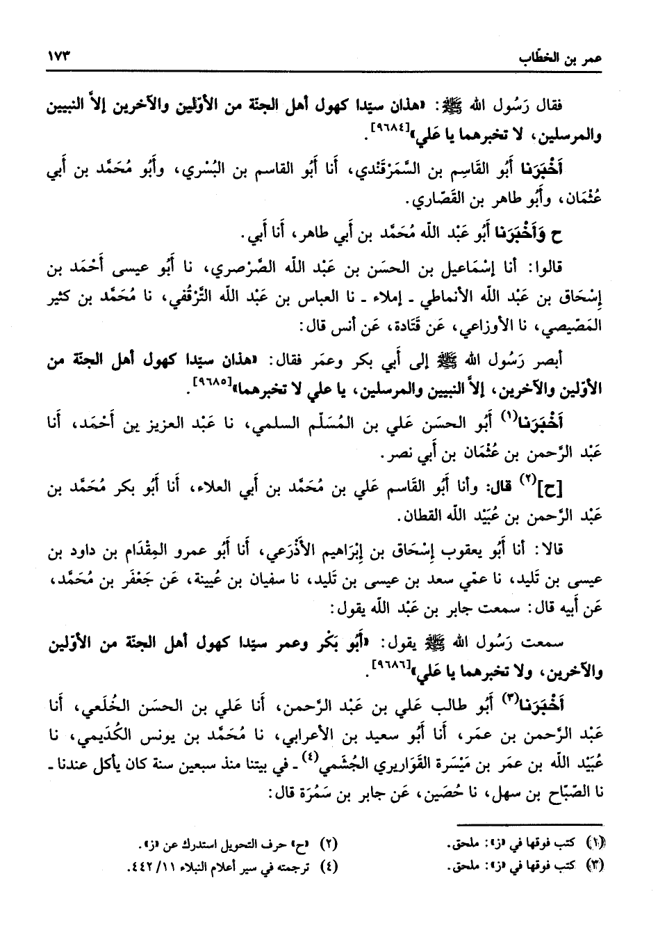 [9685] أخبرنا (1) أبو الحسن علي بن المسلم السلمي نا عبد العزيز بن أحمد أنا عبد الرحمن بن عثمان بن أبي نصر ح (2) قال وأنا أبو القاسم علي بن محمد بن أبي العلاء أنا أبو بكر محمد بن عبد الرحمن بن عبيد الله القطان قالا أنا أبو يعقوب إسحاق بن إبراهيم الأذرعي أنا أبو عمرو المقدام بن داود بن عيسى بن تليد نا عمي سعد بن عيسى بن تليد نا سفيان بن عيينة عن جعفر بن محمد عن أبيه قال سمعت جابر بن عبد الله يقول سمعت رسول الله (صلى الله عليه وسلم) يقول أبو بكر وعمر سيدا كهول أهل الجنة من الأولين والآخرين ولا تخبرهما يا علي