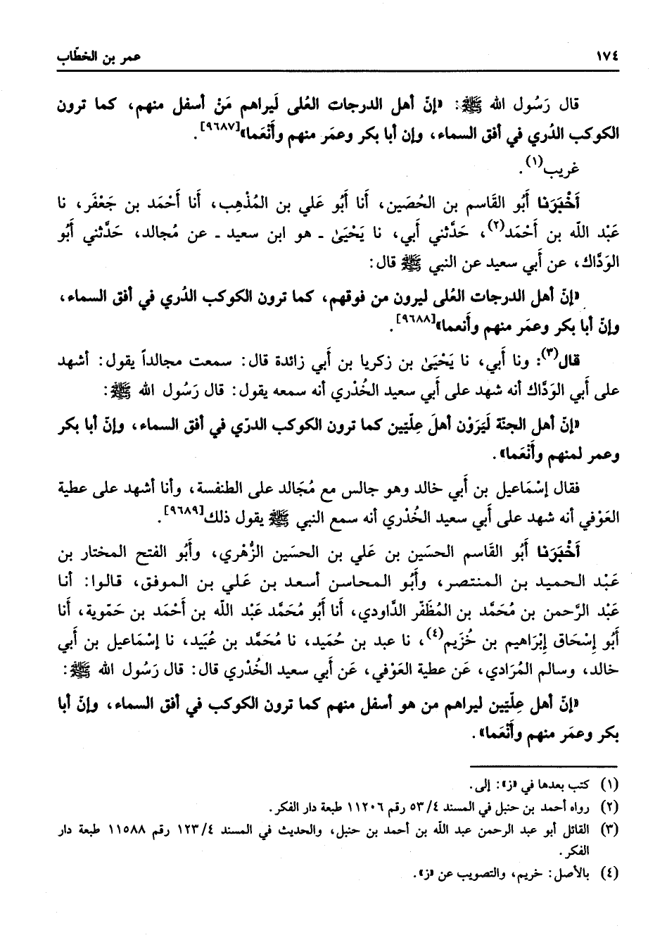 [9687] غريب (1) أخبرنا أبو القاسم بن الحصين أنا أبو علي بن المذهب أنا أحمد بن جعفر نا عبد الله بن أحمد (2) حدثني أبي نا يحيى هو ابن سعيد عن مجالد حدثني أبو الوداك عن أبي سعيد عن النبي (صلى الله عليه وسلم) قال إن أهل الدرجات العلى ليرون من فوقهم كما ترون الكوكب الدري في أفق السماء وإن أبا بكر وعمر منهم وأنعما