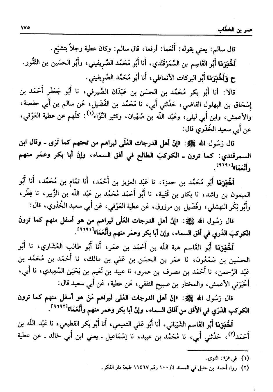 قال سالم: يعني بقوله: أنعما: أرفعا قال سالم وكان عطية رجلا يتشيع أخبرنا أبو القاسم بن السمرقندي أنا أبو محمد الصريفيني وأ الحسين بن النقور ح وأخبرنا أبو البركات الأنماطي أنا أبو محمد الصريفيني قالا أنا أبو بكر محمد بن الحسن بن عبدان الصيرفي نا أبو جعفر أحمد بن إسحاق بن البهلول القاضي حدثني أبي نا محمد بن الفضيل عن سالم بن أبي حفصة والأعمش وابن أبي ليلى وعبد الله بن صهبان وكثير النواء (1) كلهم عن عطية العوفي عن أبي سعيد الخدري قال قال رسول الله (صلى الله عليه وسلم) إن أهل الدرجات العلى ليراهم من تحتهم كما ترى وقال ابن السمرقندي كما ترون الكوكب الطالع في أفق السماء وإن أبا بكر وعمر منهم وأنعما