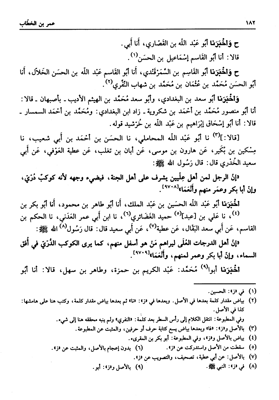 [9708] أخبرنا أبو عبد الله الحسين بن عبد الملك أنا أبو طاهر بن محمود أنا أبو بكر بن (4) نا علي بن عبد (5) حميد الغضائري (6) نا ابن أبي عمر العدني نا الحكم بن القاسم عن أبي سعد البقال عن عطية (7) عن أبي سعيد قال قال رسول (8) الله (صلى الله عليه وسلم) إن أهل الدرجات العلى ليراهم من هو أسفل منهم كما يرى الكوكب الدري في أفق السماء وإن أبا بكر وعمر لمنهم وأنعما
