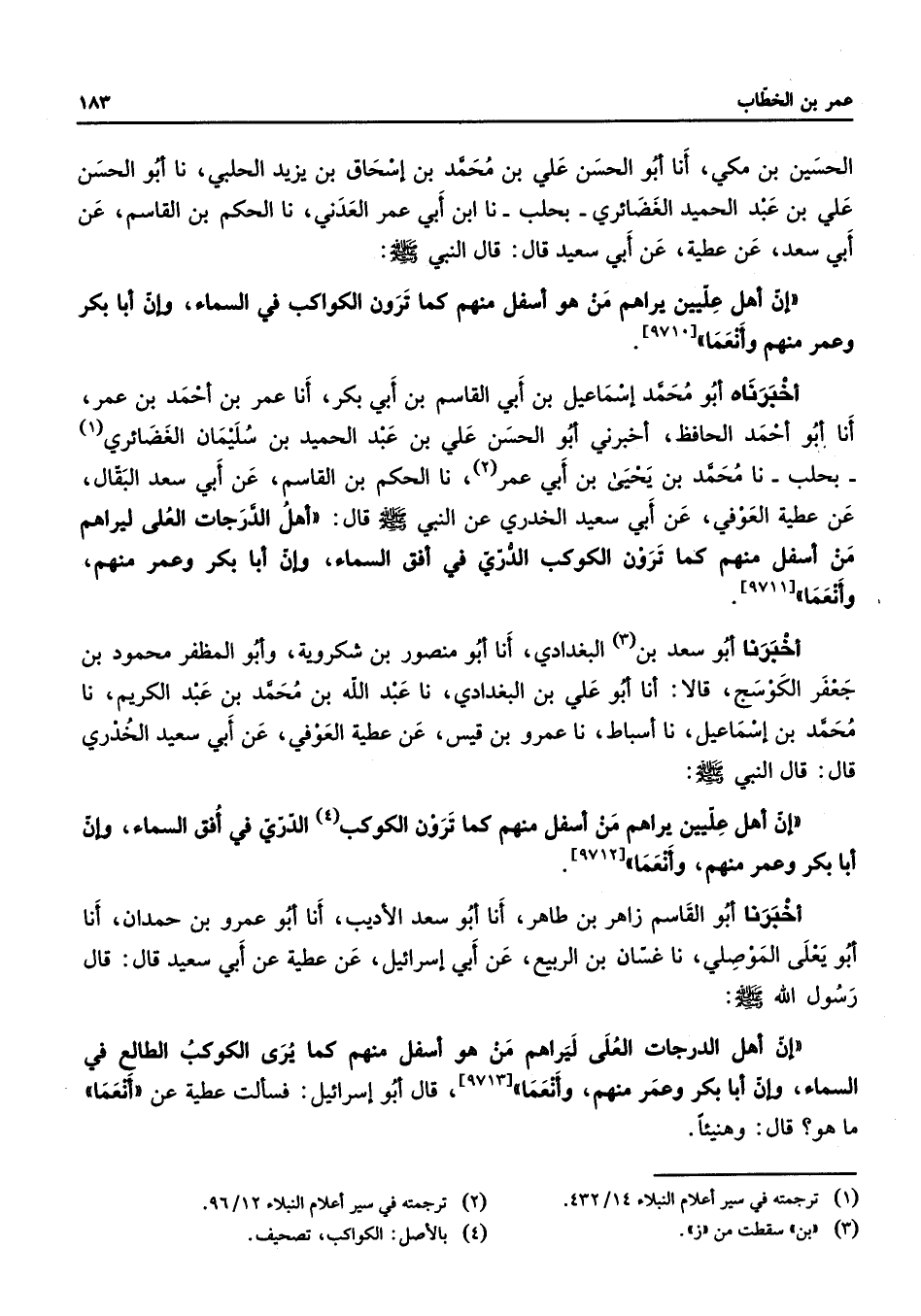 [9711] أخبرنا أبو سعد بن (3) البغدادي أنا أبو منصور بن شكروية وأبو المظفر محمود بن جعفر الكوسج قالا أنا أبو علي بن البغدادي نا عبد الله بن محمد بن عبد الكريم نا محمد بن إسماعيل نا أسباط نا عمرو بن قيس عن عطية العوفي عن أبي سعيد الخدري قال قال النبي (صلى الله عليه وسلم) إن أهل عليين يراهم من أسفل منهم كما ترون الكوكب (4) الدري في أفق السماء وإن أبا بكر وعمر منهم وأنعما