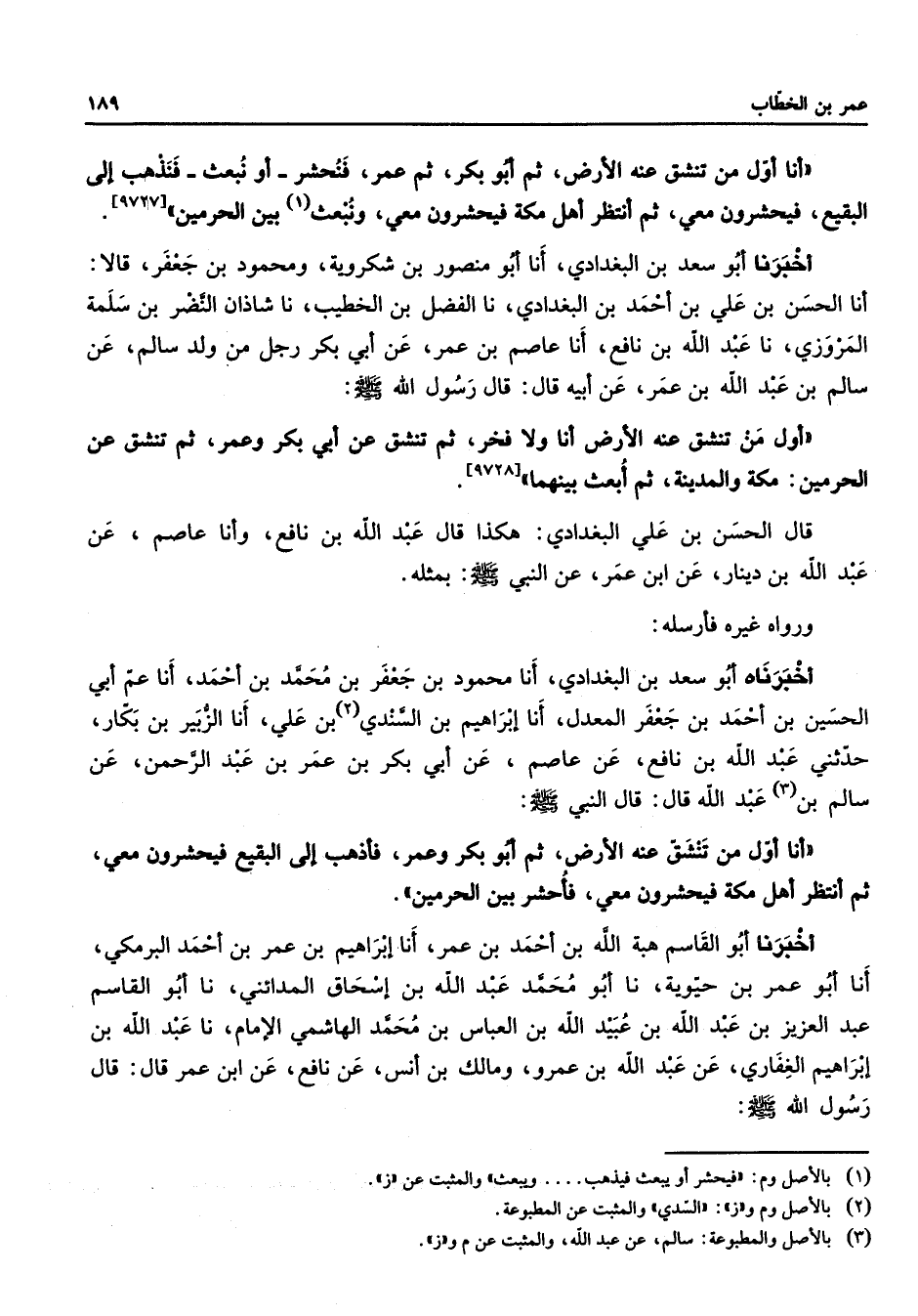 [9728] قال الحسن بن علي البغدادي هكذا قال عبد الله بن نافع وأنا عاصم عن عبد الله بن دينار عن ابن عمر عن النبي (صلى الله عليه وسلم) بمثله ورواه غيره فأرسله أخبرناه أبو سعد بن البغدادي أنا محمود بن جعفر بن محمد بن أحمد أنا عم أبي الحسين بن أحمد بن جعفر المعدل أنا إبراهيم بن السندي (2) بن علي أنا الزبير بن بكار حدثني عبد الله بن نافع عن عاصم عن أبي بكر بن عمر بن عبد الرحمن عن سالم بن (3) عبد الله قال قال النبي (صلى الله عليه وسلم) أنا أول من تنشق عنه الأرض ثم أبو بكر وعمر فأذهب إلى البقيع فيحشرون معي ثم أنتظر أهل مكة فيحشرون معي فأحشر بين الحرمين أخبرنا أبو القاسم هبة الله بن أحمد بن عمر أنا إبراهيم بن عمر بن أحمد البرمكي أنا أبو عمر بن حيوية نا أبو محمد عبد الله بن إسحاق المدائني نا أبو القاسم عبد العزيز بن عبد الله بن عبيد الله بن العباس بن محمد الهاشمي الإمام نا عبد الله بن إبراهيم الغفاري عن عبد الله بن عمرو ومالك بن أنس عن نافع عن ابن عمر قال قال رسول الله (صلى الله عليه وسلم)