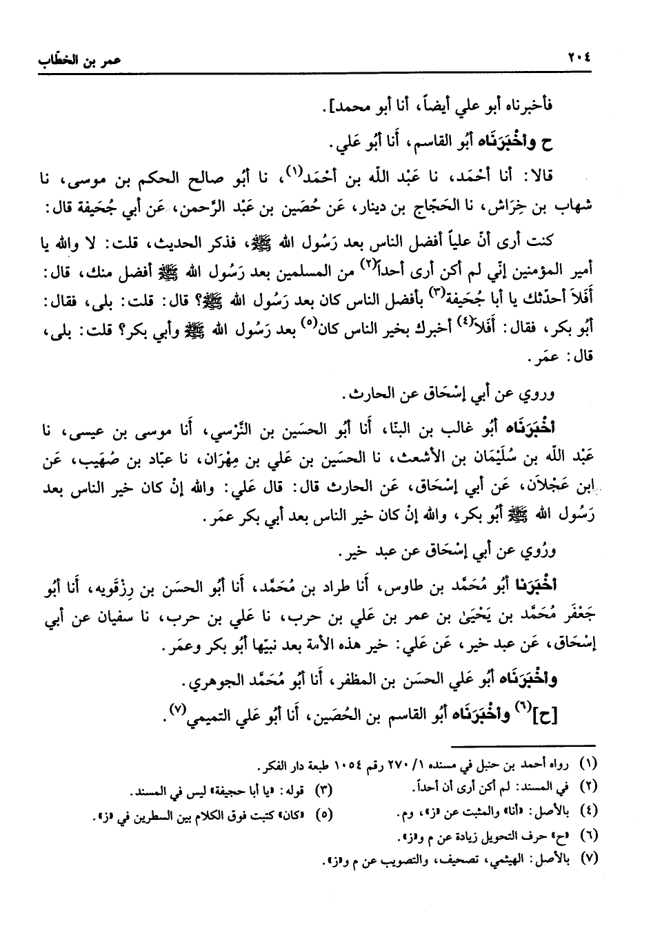 فأخبرناه أبو علي أيضا أنا أبو محمد ح وأخبرناه أبو القاسم أنا أبو علي قالا أنا أحمد نا عبد الله بن أحمد (1) نا أبو صالح الحكم بن موسى نا شهاب بن خراش نا الحجاج بن دينار عن حصين بن عبد الرحمن عن أبي جحيفة قال كنت أرى أن عليا أفضل الناس بعد رسول الله (صلى الله عليه وسلم) فذكر الحديث قلت لا والله يا أمير المؤمنين إني لم أكن أرى أحدا (2) من المسلمين بعد رسول الله (صلى الله عليه وسلم) أفضل منك قال أفلا أحدثك يا أبا جحيفة (3) بأفضل الناس كان بعد رسول الله (صلى الله عليه وسلم) قال قلت بلى فقال أبو بكر فقال أفلا (4) أخبرك بخير الناس كان (5) بعد رسول الله (صلى الله عليه وسلم) وأبي بكر قلت بلى قال عمر وروي عن أبي إسحاق عن الحارث أخبرناه أبو غالب بن البنا أنا أبو الحسين بن النرسي أنا موسى بن عيسى نا عبد الله بن سليمان بن الأشعث نا الحسين بن علي بن مهران نا عباد بن صهيب عن ابن عجلان عن أبي إسحاق عن الحارث قال قال علي والله إن كان خير الناس بعد رسول الله (صلى الله عليه وسلم) أبو بكر والله إن كان خير الناس بعد أبي بكر عمر وروي عن أبي إسحاق عن عبد خير أخبرنا أبو محمد بن طاوس أنا طراد بن محمد أنا أبو الحسن بن رزقويه أنا أبو جعفر محمد بن يحيى بن عمر بن علي بن حرب نا علي بن حرب نا سفيان عن أبي إسحاق عن عبد خير عن علي خير هذه الأمة بعد نبيها أبو بكر وعمر وأخبرناه أبو علي الحسن بن المظفر أنا أبو محمد الجوهري ح (6) وأخبرناه أبو القاسم بن الحصين أنا أبو علي التميمي (7)