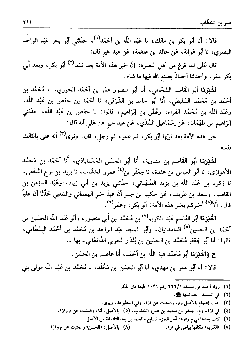 قالا أنا أبو بكر بن مالك نا عبد الله بن أحمد (1) حدثني أبو بحر عبد الواحد البصري نا أبو عوانة عن خالد بن علقمة عن عبد خير قال قال علي لما فرغ من أهل البصرة إن خير هذه الأمة بعد نبيها (2) أبو بكر وبعد أبي بكر عمر وأحدثنا أحداثا يصنع الله فيها ما شاء أخبرنا أبو القاسم الشحامي أنا أبو منصور عمر بن أحمد الحوري نا محمد بن أحمد بن محمد السليطي أنا أبو حامد بن الشرقي نا أحمد بن حفص بن عبد الله وعبد الله بن محمد الفراء وقطن بن إبراهيم قالوا نا حفص بن عبد الله حدثني إبراهيم بن طهمان عن إسماعيل السدي عن عبد خير عن علي أنه قال خير هذه الأمة بعد نبيها أبو بكر ثم عمر ثم رجل قال ونرى (3) أنه عنى بالثالث نفسه أخبرنا أبو القاسم بن مندوية أنا أبو الحسن الحسناباذي أنا أحمد بن محمد الأهوازي نا أبو العباس بن عقدة نا جعفر بن (4) عمرو الخشاب نا يزيد بن نوح النخعي نا زكريا بن عبد الله بن يزيد الصهباني حدثني يزيد بن أبي زياد وعبد المؤمن بن القاسم وسعد بن طريف عن حكيم بن جبير أن عبد خير الهمداني والشعبي حدثا أن عليا قال ألا (5) أخبركم بخير هذه الأمة أبو بكر وعمر (6) أخبرنا أبو القاسم عبد الكريم (7) بن محمد بن أبي منصور وأبو عبد الله الحسين بن أحمد بن الحسين (8) الدامغانيان وأبو المجد عبد الواحد بن محمد بن أحمد البسطامي قالوا أنا أبو جعفر محمد بن الحسين بن بندار الحربي الدامغاني بها ح وأخبرنا أبو محمد هبة الله بن أحمد أنا عاصم بن الحسن قالا أنا أبو عمر بن مهدي أنا أبو الحسن بن مخلد نا محمد بن عبد الله مولى بني