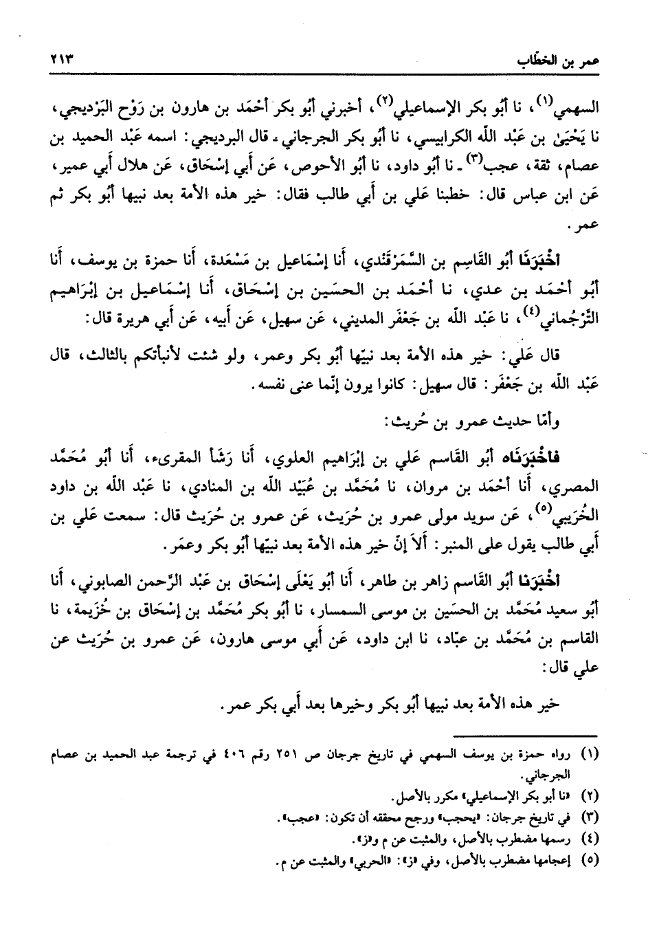 السهمي (1) نا أبو بكر الإسماعيلي (2) أخبرني أبو بكر أحمد بن هارون بن روح البرديجي نا يحيى بن عبد الله الكرابيسي نا أبو بكر الجرجاني قال البرديجي اسمه عبد الحميد بن عصام ثقة عجب (3) نا أبو داود نا أبو الأحوص عن أبي إسحاق عن هلال أبي عمير عن ابن عباس قال خطبنا علي بن أبي طالب فقال خير هذه الأمة بعد نبيها أبو بكر ثم عمر أخبرنا أبو القاسم بن السمرقندي أنا إسماعيل بن مسعدة أنا حمزة بن يوسف أنا أبو أحمد بن عدي نا أحمد بن الحسين بن إسحاق أنا إسماعيل بن إبراهيم الترجماني (4) نا عبد الله بن جعفر المديني عن سهيل عن أبيه عن أبي هريرة قال قال علي خير هذه الأمة بعد نبيها أبو بكر وعمر ولو شئت لأنبأتكم بالثالث قال عبد الله بن جعفر قال سهيل كانوا يرون إنما عنى نفسه وأما حديث عمرو بن حريث فأخبرناه أبو القاسم علي بن إبراهيم العلوي أنا رشأ المقرئ أنا أبو محمد المصري أنا أحمد بن مروان نا محمد بن عبيد الله بن المنادي نا عبد الله بن داود الخريبي (5) عن سويد مولى عمرو بن حريث عن عمرو بن حريث قال سمعت علي بن أبي طالب يقول على المنبر ألا إن خير هذه الأمة بعد نبيها أبو بكر وعمر أخبرنا أبو القاسم زاهر بن طاهر أنا أبو يعلى إسحاق بن عبد الرحمن الصابوني أنا أبو سعيد محمد بن الحسين بن موسى السمسار نا أبو بكر محمد بن إسحاق بن خزيمة نا القاسم بن محمد بن عباد نا ابن داود عن أبي موسى هارون عن عمرو بن حريث عن علي قال خير هذه الأمة بعد نبيها أبو بكر وخيرها بعد أبي بكر عمر