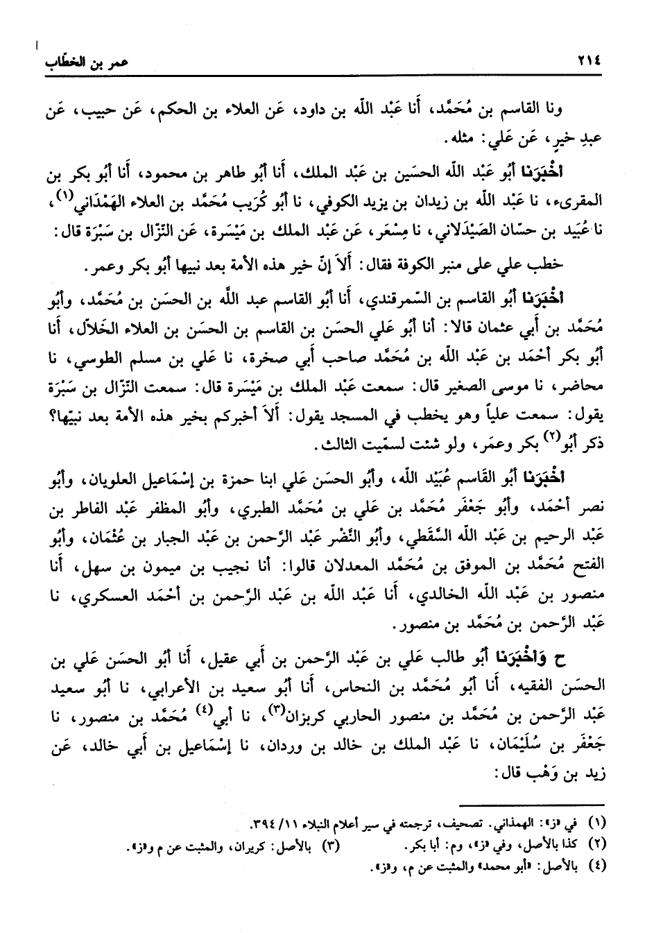 ونا القاسم بن محمد أنا عبد الله بن داود عن العلاء بن الحكم عن حبيب عن عبد خير عن علي مثله أخبرنا أبو عبد الله الحسين بن عبد الملك أنا أبو طاهر بن محمود أنا أبو بكر بن المقرئ نا عبد الله بن زيدان بن يزيد الكوفي نا أبو كريب محمد بن العلاء الهمداني (1) نا عبيد بن حسان الصيدلاني نا مسعى رعن عبد الملك بن ميسرة عن النزال بن سبرة قال خطب علي على منبر الكوفة فقال ألا إن خير هذه الأمة بعد نبيها أبو بكر وعمر أخبرنا أبو القاسم بن السمرقندي أنا أبو القاسم عبد الله بن الحسن بن محمد وأبو محمد بن أبي عثمان قالا أنا أبو علي الحسن بن القاسم بن الحسن بن العلاء الخلال أنا أبو بكر أحمد بن عبد الله بن محمد صاحب أبي صخرة نا علي بن مسلم الطوسي نا محاضر نا موسى الصغير قال سمعت عبد الملك بن ميسرة قال سمعت النزال بن سبرة يقول سمعت عليا وهو يخطب في المسجد يقول ألا أخبركم بخير هذه الأمة بعد نبيها ذكر أبو (2) بكر وعمر ولو شئت لسميت الثالث أخبرنا أبو القاسم عبيد الله وأبو الحسن علي ابنا حمزة بن إسماعيل العلويان وأبو نصر أحمد وأبو جعفر محمد بن علي بن محمد الطبري وأبو المظفر عبد الفاطر بن عبد الرحيم بن عبد الله السقطي وأبو النضر عبد الرحمن بن عبد الجبار بن عثمان وأبو الفتح محمد بن الموفق بن محمد المعدلان قالوا أنا نجيب بن ميمون بن سهل أنا منصور بن عبد الله الخالدي أنا عبد الله بن عبد الرحمن بن أحمد العسكري نا عبد الرحمن بن محمد بن منصور ح وأخبرنا أبو طالب علي بن عبد الرحمن بن أبي عقيل أنا أبو الحسن علي بن الحسن الفقيه أنا أبو محمد بن النحاس أنا أبو سعيد بن الأعرابي نا أبو سعيد عبد الرحمن بن محمد بن منصور الحاربي كربزان (3) نا أبي (4) محمد بن منصور نا جعفر بن سليمان نا عبد الملك بن خالد بن وردان نا إسماعيل بن أبي خالد عن زيد بن وهب قال