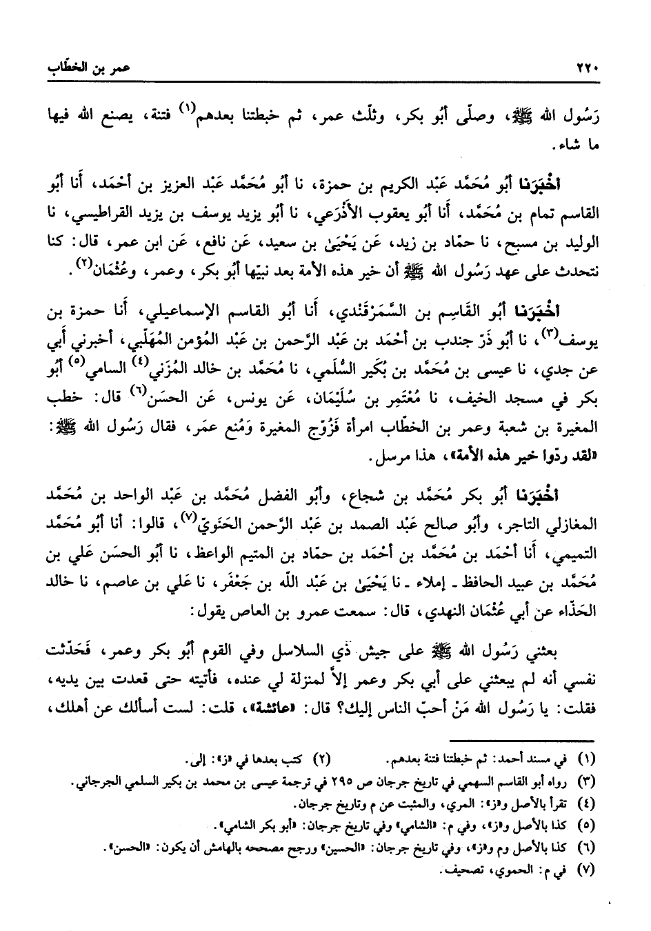 رسول الله (صلى الله عليه وسلم) وصلى أبو بكر وثلث عمر ثم خبطتنا بعدهم (1) فتنة يصنع الله فيها ما شاء أخبرنا أبو محمد عبد الكريم بن حمزة نا أبو محمد عبد العزيز بن أحمد أنا أبو القاسم تمام بن محمد أنا أبو يعقوب الأذرعي نا أبو يزيد يوسف بن يزيد القراطيسي نا الوليد بن مسبح نا حماد بن زيد عن يحيى بن سعيد عن نافع عن ابن عمر قال كنا نتحدث على عهد رسول الله (صلى الله عليه وسلم) أن خير هذه الأمة بعد نبيها أبو بكر وعمر وعثمان (2) أخبرنا أبو القاسم بن السمرقندي أنا أبو القاسم الإسماعيلي أنا حمزة بن يوسف (3) نا أبو ذر جندب بن أحمد بن عبد الرحمن بن عبد المؤمن المهلبي أخبرني أبي عن جدي نا عيسى بن محمد بن بكير السلمي نا محمد بن خالد المزني السامي (5) أبو بكر في مسجد الخيف نا معتمر بن سليمان عن يونس عن الحسن قال خطب المغيرة بن شعبة وعمر بن الخطاب امرأة فزوج المغيرة ومنع عمر فقال رسول الله (صلى الله عليه وسلم) لقد ردوا خير هذه الأمة هذا مرسل أخبرنا أبو بكر محمد بن شجاع وأبو الفضل محمد بن عبد الواحد بن محمد المغازلي التاجر وأبو صالح عبد الصمد بن عبد الرحمن الحنوي قالوا أنا أبو محمد التميمي أنا أحمد بن محمد بن أحمد بن حماد بن المتيم الواعظ نا أبو الحسن علي بن محمد بن عبيد الحافظ إملاء نا يحيى بن عبد الله بن جعفر نا علي بن عاصم نا خالد الحذاء عن أبي عثمان النهدي قال سمعت عمرو بن العاص يقول بعثني رسول الله (صلى الله عليه وسلم) على جيش ذي السلاسل وفي القوم أبو بكر وعمر فحدثت نفسي أنه لم يبعثني على أبي بكر وعمر إلا لمنزلة لي عنده فأتيته حتى قعدت بين يديه فقلت يا رسول الله من أحب الناس إليك قال عائشة قلت لست أسألك عن أهلك