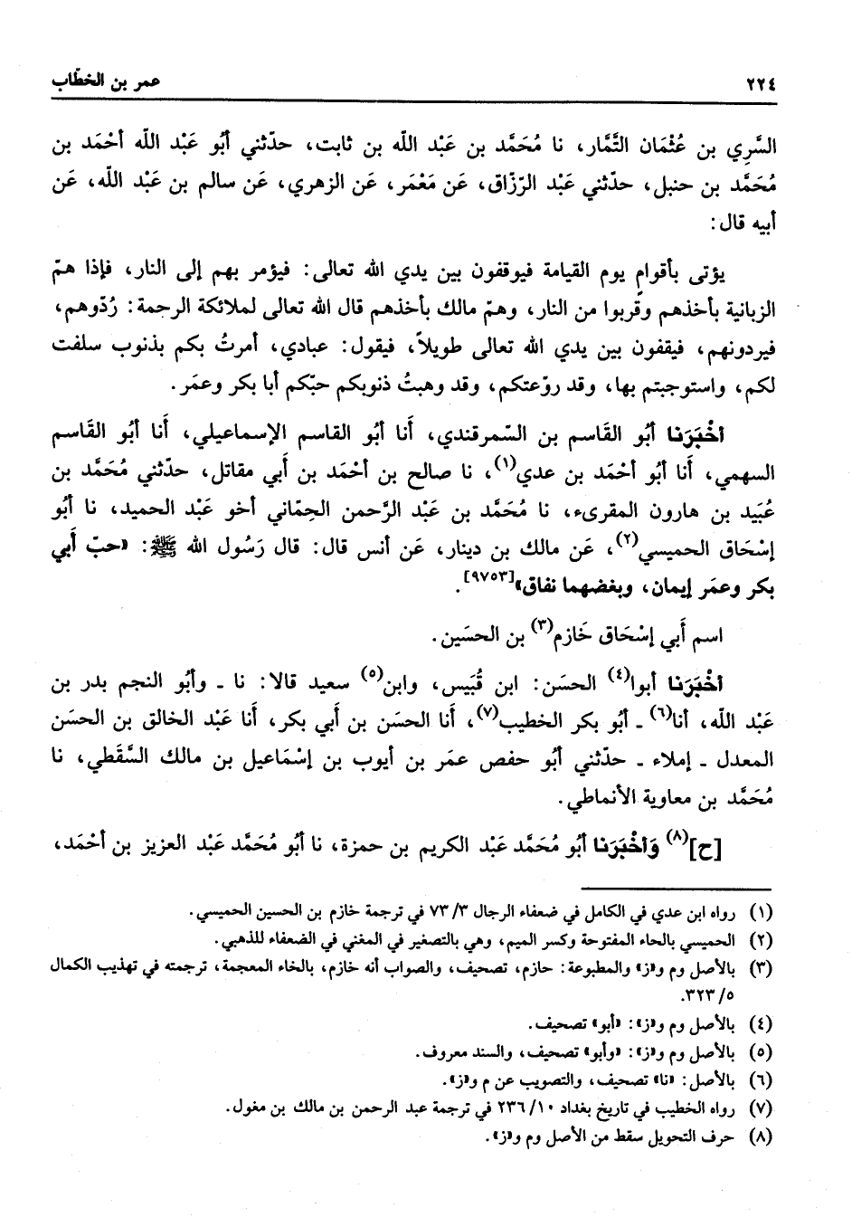 السري بن عثمان التمار نا محمد بن عبد الله بن ثابت حدثني أبو عبد الله أحمد بن محمد بن حنبل حدثني عبد الرزاق عن معمر عن الزهري عن سالم بن عبد الله عن أبيه قال يؤتى بأقوام يوم القيامة فيوقفون بين يدي الله تعالى فيؤمر بهم إلى النار فإذا هم الزبانية بأخذهم وقربوا من النار وهم مالك بأخذهم قال الله تعالى لملائكة الرحمة ردوهم فيردونهم فيقفون بين يدي الله تعالى طويلا فيقول عبادي أمرت بكم بذنوب سلفت لكم واستوجبتم بها وقد روعتكم وقد وهبت ذنوبكم حبكم أبا بكر وعمر أخبرنا أبو القاسم بن السمرقندي أنا أبو القاسم الإسماعيلي أنا أبو القاسم السهمي أنا أبو أحمد بن عدي (1) نا صالح بن أحمد بن أبي مقاتل حدثني محمد بن عبيد بن هارون المقرئ نا محمد بن عبد الرحمن الحماني أخو عبد الحميد نا أبو إسحاق الحميسي (2) عن مالك بن دينار عن أنس قال قال رسول الله (صلى الله عليه وسلم) حب أبي بكر وعمر إيمان وبغضهما نفاق