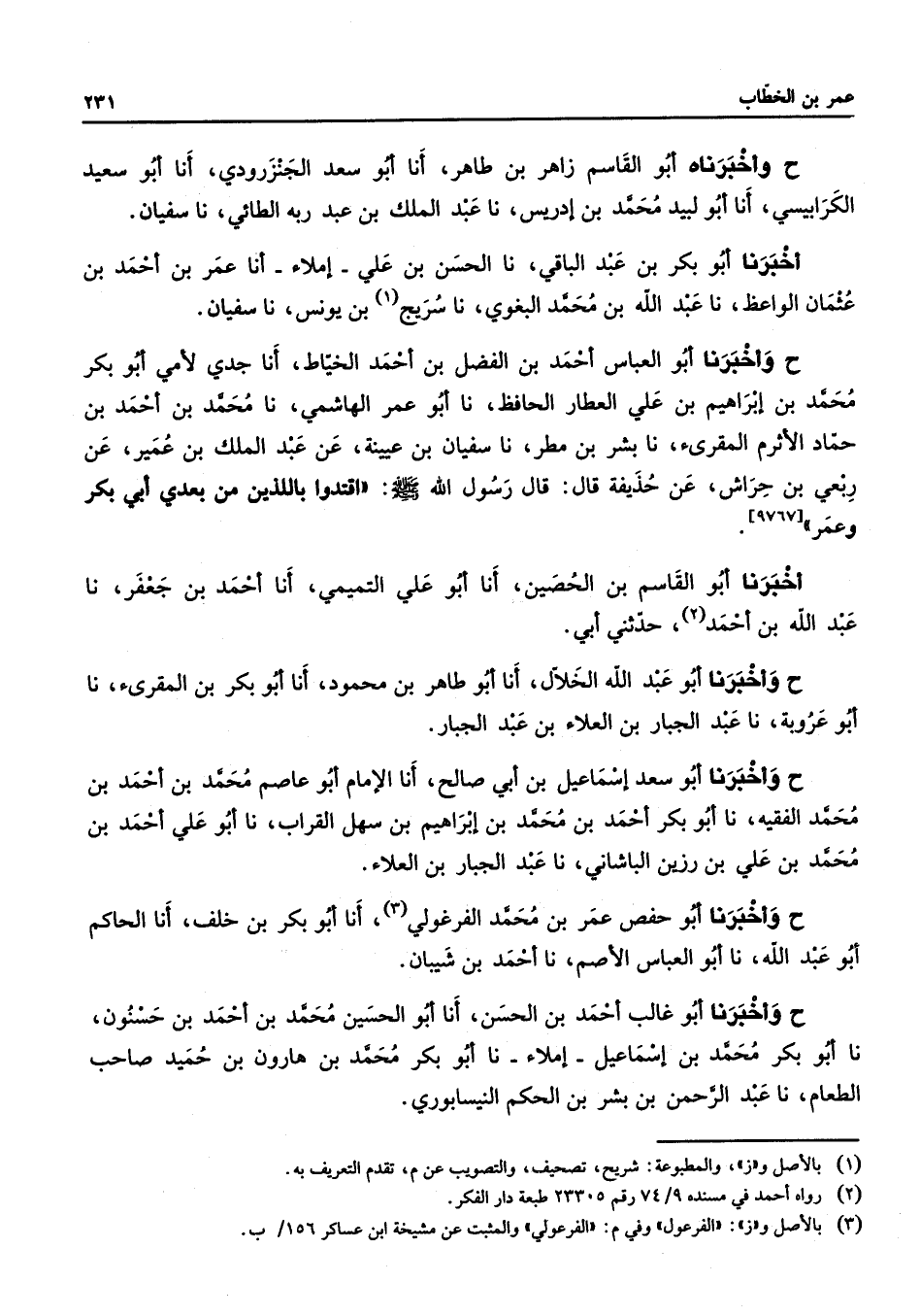 ح وأخبرناه أبو القاسم زاهر بن طاهر أنا أبو سعد الجنزرودي أنا أبو سعيد الكرابيسي أنا أبو لبيد محمد بن إدريس نا عبد الملك بن عبد ربه الطائي نا سفيان أخبرنا أبو بكر بن عبد الباقي نا الحسن بن علي إملاء أنا عمر بن أحمد بن عثمان الواعظ نا عبد الله بن محمد البغوي نا سريج (1) بن يونس نا سفيان ح وأخبرنا أبو العباس أحمد بن الفضل بن أحمد الخياط أنا جدي لأمي أبو بكر محمد بن إبراهيم بن علي العطار الحافظ نا أبو عمر الهاشمي نا محمد بن أحمد بن حماد الأثرم المقرئ نا بشر بن مطر نا سفيان بن عيينة عن عبد الملك بن عمير عن ربعي بن حراش عن حذيفة قال قال رسول الله (صلى الله عليه وسلم) اقتدوا باللذين من بعدي أبي بكر وعمر