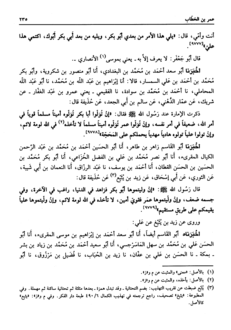 [9777] قال أبو جعفر لا يعرف إلا به يعني بموسى (1) الأنصاري أخبرنا أبو سعد أحمد بن محمد بن البغدادي أنا أبو منصور بن شكروية وأبو بكر محمد بن أحمد بن علي السمسار قالا أنا إبراهيم بن عبد الله بن محمد نا أبو عبد الله المحاملي نا أحمد بن محمد بن سوادة نا الفقيمي يعني عمرو بن عبد الغفار عن شريك عن عمار الدهني عن سالم بن أبي الجعد عن حذيفة قال ذكرت الإمارة عند رسول الله (صلى الله عليه وسلم) فقال إن تولوا أبا بكرة تولوه أمينا مسلما قويا في أمر الله ضعيفا في أمر نفسه وإن تولوا عمر تولوه أمينا مسلما لا تأخذه (2) في الله لومة لائم وإن تولوا عليا تولوه هاديا مهديا يحملكم على المحجة