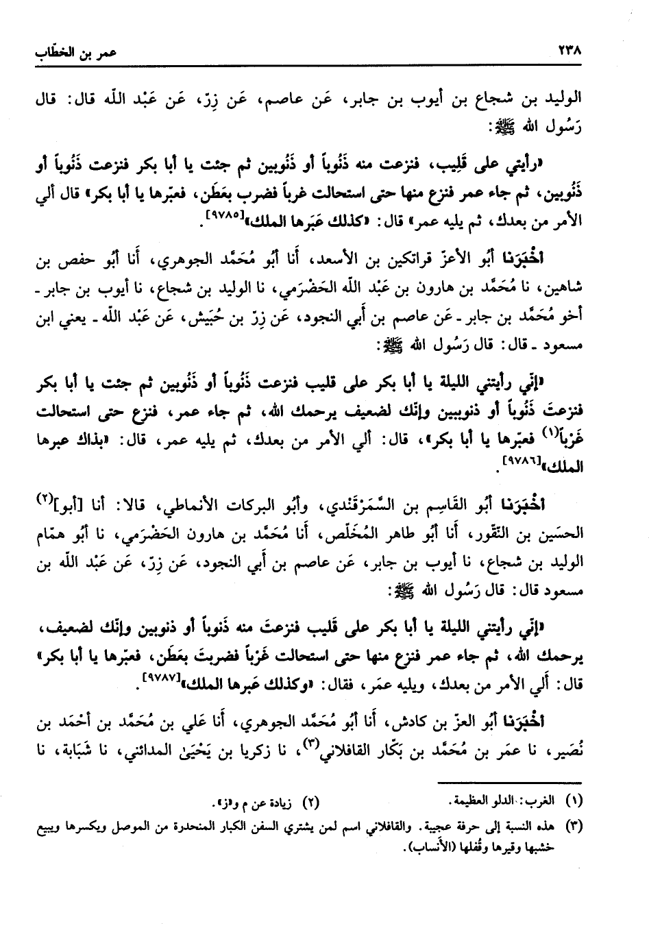 الوليد بن شجاع بن أيوب بن جابر عن عاصم عن زر عن عبد الله قال قال رسول الله (صلى الله عليه وسلم) رأيتي على قليب فنزعت منه ذنوبا أو ذنوبين ثم جئت يا أبا بكر فنزعت ذنوبا أو ذنوبين ثم جاء عمر فنزع منها حتى استحالت غربا فضرب بعطن فعبرها يا أبا بكر قال ألي الأمر من بعدك ثم يليه عمر قال كذلك عبرها الملك