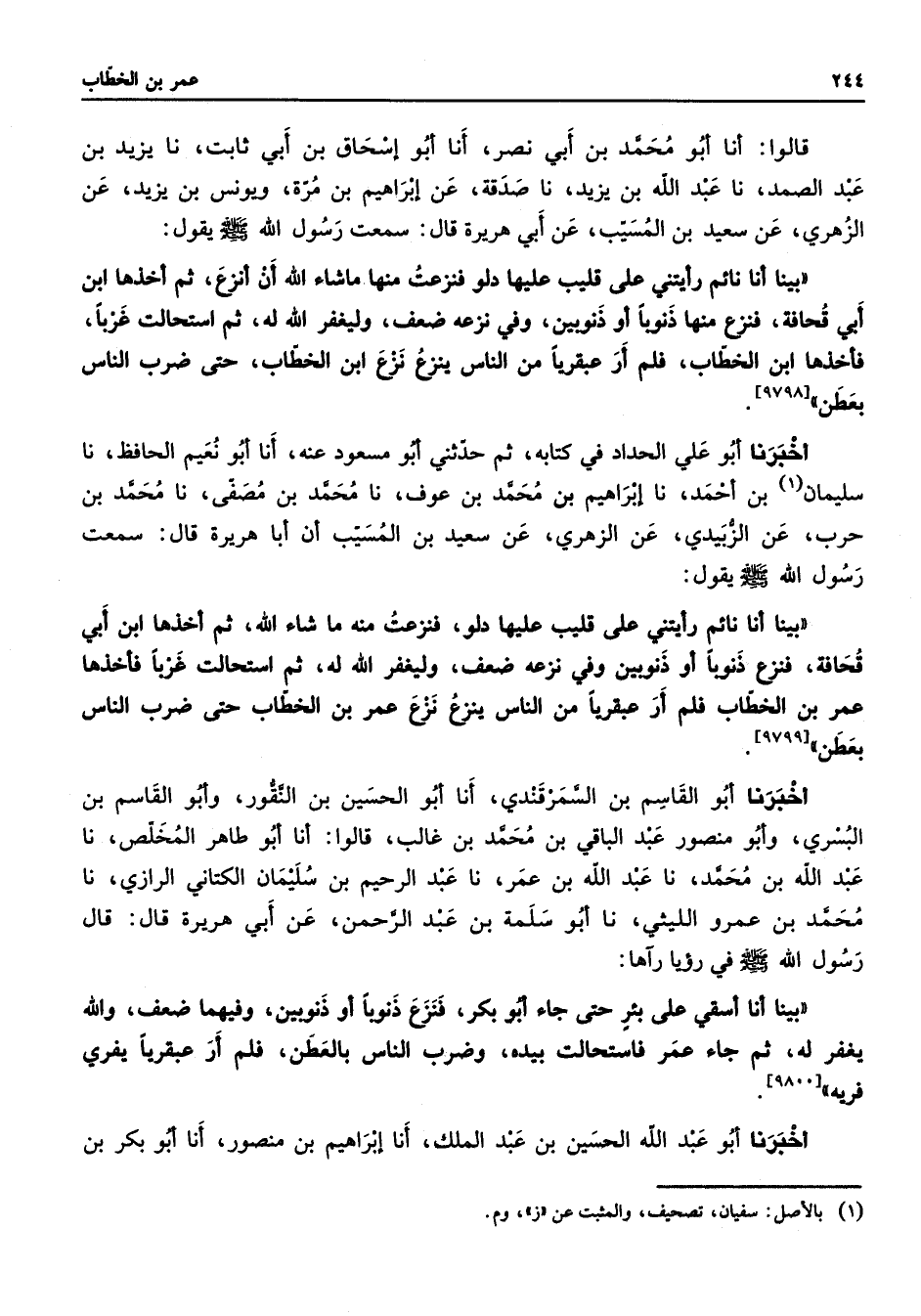 قالوا أنا أبو محمد بن أبي نصر أنا أبو إسحاق بن أبي ثابت نا يزيد بن عبد الصمد نا عبد الله بن يزيد نا صدقة عن إبراهيم بن مرة ويونس بن يزيد عن الزهري عن سعيد بن المسيب عن أبي هريرة قال سمعت رسول الله (صلى الله عليه وسلم) يقول بينا أنا نائم رأيتني على قليب عليها دلو فنزعت منها ما شاء الله أن أنزع ثم أخذها ابن أبي قحافة فنزع منها ذنوبا أو ذنوبين وفي نزعه ضعف وليغفر الله له ثم استحالت غربا فأخذها ابن الخطاب فلم أر عبقريا من الناس ينزع نزع ابن الخطاب حتى ضرب الناس بعطن
