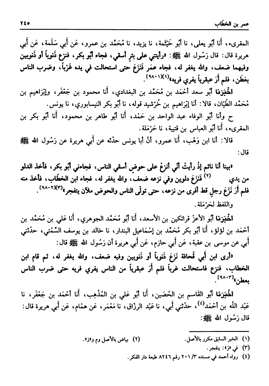 [9801] أخبرنا أبو سعد أحمد بن محمد بن البغدادي أنا محمود بن جعفر وإبراهيم بن محمد الطيان قالا أنا إبراهيم بن خرشيد قوله نا أبو بكر النيسابوري نا يونس ح وأنا أبو الوفاء عبد الواحد بن حمد أنا أبو طاهر بن محمود أنا أبو بكر بن المقرئ أنا أبو العباس بن قتيبة نا حرملة قالا أنا ابن وهب أنا عمرو أن أبا يونس حدثه عن أبي هريرة عن رسول الله (صلى الله عليه وسلم) قال بينا أنا نائم إذ رأيت أني أنزع على حوض أسقي الناس فجاءني أبو بكر فأخذ الدلو من يدي (2) فنزع دلوين وفي نزعه ضعف والله يغفر له فجاء ابن الخطاب فأخذ منه فلم أر نزع رجل قط أفرى من نزعه حتى تولى الناس والحوض ملآن يتفجر (3)