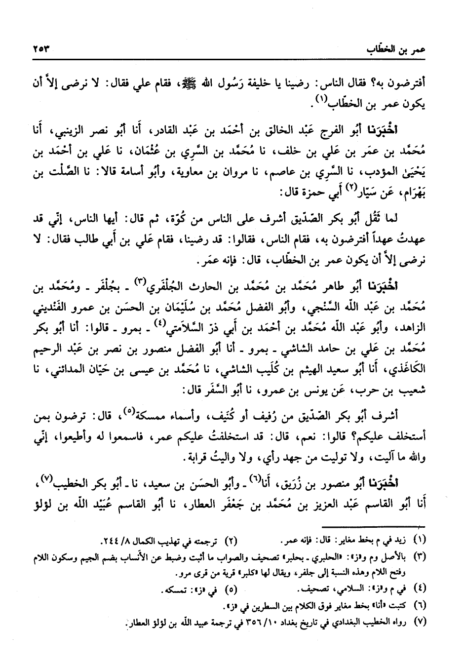 أفترضون به فقال الناس رضينا يا خليفة رسول الله (صلى الله عليه وسلم) فقام علي فقال لا نرضى إلا أن يكون عمر بن الخطاب (1) أخبرنا أبو الفرج عبد الخالق بن أحمد بن عبد القادر أنا أبو نصر الزينبي أنا محمد بن عمر بن علي بن خلف نا محمد بن السري بن عثمان نا علي بن أحمد بن يحيى المؤدب نا السري بن عاصم نا مروان بن معاوية وأبو أسامة قالا نا الصلت بن بهرام عن سيار (2) أبي حمزة قال لما ثقل أبو بكر الصديق أشرف على الناس من كوة ثم قال أيها الناس إني قد عهدت عهدا أفترضون به فقام الناس فقالوا قد رضينا فقام علي بن أبي طالب فقال لا نرضى إلا أن يكون عمر بن الخطاب قال فإنه عمر أخبرنا أبو طاهر محمد بن محمد بن الحارث الجلفري (3) بجلفر ومحمد بن محمد بن عبد الله السنجي وأبو الفضل محمد بن سليمان بن الحسن بن عمرو الفنديني الزاهد وأبو عبد الله محمد بن أحمد بن أبي ذر السلامتي (4) بمرو قالوا أنا أبو بكر محمد بن علي بن حامد الشاشي بمرو أنا أبو الفضل منصور بن نصر بن عبد الرحيم الكاغذي أنا أبو سعيد الهيثم بن كليب الشاشي نا محمد بن عيسى بن حيان المدائني نا شعيب بن حرب عن يونس بن عمرو نا أبو السفر قال أشرف أبو بكر الصديق من رفيف أو كنيف وأسماء ممسكة (5) قال ترضون بمن أستخلف عليكم قالوا نعم قال قد استخلفت عليكم عمر فاسمعوا له وأطيعوا إني والله ما آليت ولا توليت من جهد رأي ولا واليت قرابة أخبرنا أبو منصور بن زريق أنا (6) وأبو الحسن بن سعيد نا أبو بكر الخطيب (7) أنا أبو القاسم عبد العزيز بن محمد بن جعفر العطار نا أبو القاسم عبيد الله بن لؤلؤ