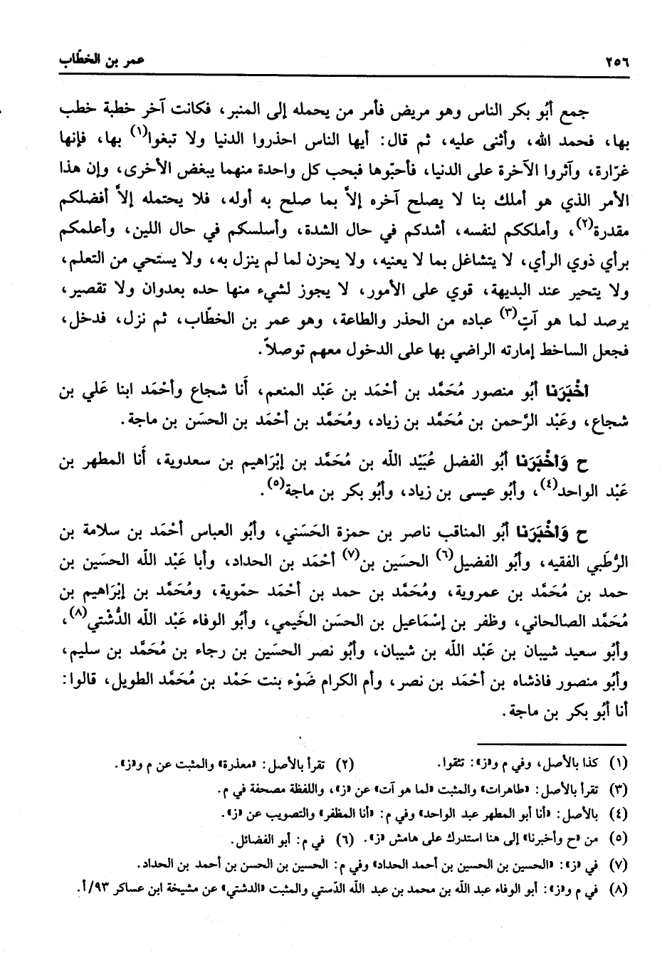 جمع أبو بكر الناس وهو مريض فأمر من يحمله إلى المنبر فكانت آخر خطبة خطب بها فحمد الله وأثنى عليه ثم قال أيها الناس احذروا الدنيا ولا تبغوا (1) بها فإنها غرارة وآثروا الآخرة على الدنيا فأحبوها فبحب كل واحدة منهما يبغض الأخرى وإن هذا الأمر الذي هو أملك بنا لا يصلح آخره إلا بما صلح به أوله فلا يحتمله إلا أفضلكم مقدرة (2) وأملككم لنفسه أشدكم في حال الشدة وأسلسكم في حال اللين وأعلمكم برأي ذوي الرأي لا يتشاغل بما لا يعنيه ولا يحزن لما لم ينزل به ولا يستحي من التعلم ولا يتحير عند البديهة قوي على الأمور لا يجوز لشئ منها حده بعدوان ولا تقصير يرصد لما هو آت (3) عباده من الحذر والطاعة وهو عمر بن الخطاب ثم نزل فدخل فجعل الساخط إمارته الراضي بها على الدخول معهم توصلا أخبرنا أبو منصور محمد بن أحمد بن عبد المنعم أنا شجاع وأحمد ابنا علي بن شجاع وعبد الرحمن بن محمد بن زياد ومحمد بن أحمد بن الحسن بن ماجة ح وأخبرنا أبو الفضل عبيد الله بن محمد بن إبراهيم بن سعدوية أنا المطهر بن عبد الواحد (4) وأبو عيسى بن زياد وأبو بكر بن ماجة (5) ح وأخبرنا أبو المناقب ناصر بن حمزة الحسني وأبو العباس أحمد بن سلامة بن الرطبي الفقيه وأبو الفضيل (6) الحسين بن (7) أحمد بن الحداد وأبا عبد الله الحسين بن حمد بن محمد بن عمروية ومحمد بن حمد بن أحمد حموية ومحمد بن إبراهيم بن محمد الصالحاني وظفر بن إسماعيل بن الحسن الخيمي وأبو الوفاء عبد الله الدشتي (8) وأبو سعيد شيبان بن عبد الله بن شيبان وأبو نصر الحسين بن رجاء بن محمد بن سليم وأبو منصور فاذشاه بن أحمد بن نصر وأم الكرام ضوء بنت حمد بن محمد الطويل قالوا أنا أبو بكر بن ماجة