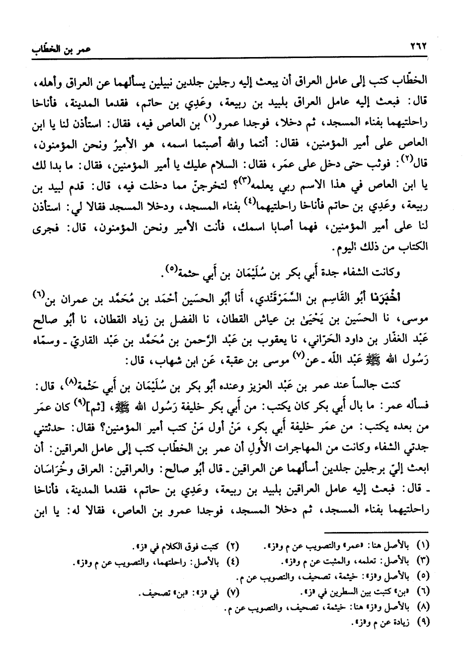 الخطاب كتب إلى عامل العراق أن يبعث إليه رجلين جلدين نبيلين يسألهما عن العراق وأهله قال فبعث إليه عامل العراق بلبيد بن ربيعة وعدي بن حاتم فقدما المدينة فأناخا راحلتيهما بفناء المسجد ثم دخلا فوجدا عمرو (1) بن العاص فيه فقال استأذن لنا يا ابن العاص على أمير المؤمنين فقال أنتما والله أصبتما اسمه هو الأمير ونحن المؤمنون قال (2) فوثب حتى دخل على عمر فقال السلام عليك يا أمير المؤمنين فقال ما بدا لك يا ابن العاص في هذا الاسم ربي يعلمه لتخرجن مما دخلت فيه قال قدم لبيد بن ربيعة وعدي بن حاتم فأناخا راحلتيهما بفناء المسجد ودخلا المسجد فقالا لي استأذن لنا على أمير المؤمنين فهما أصابا اسمك فأنت الأمير ونحن المؤمنون قال فجرى الكتاب من ذلك اليوم وكانت الشفاء جدة أبي بكر بن سليمان بن أبي حثمة (5)