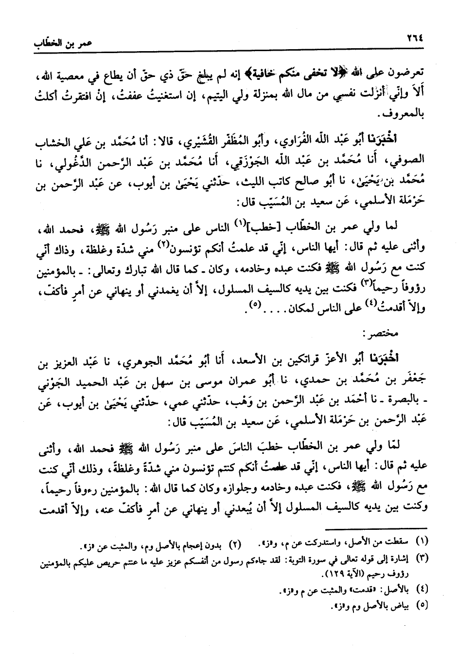 تعرضون على الله " لا تخفى منكم خافية " إنه لم يبلغ حق ذي حق أن يطاع في معصية الله ألا وإني أنزلت نفسي من الله بمنزلة ولي اليتيم إن استغنيت عففت إن افتقرت أكلت بالمعروف أخبرنا أبو عبد الله الفراوي وأبو المظفر القشيري قالا أنا محمد بن علي الخشاب الصوفي أنا محمد بن عبد الله الجوزقي أنا محمد بن عبد الرحمن الدغولي نا محمد بن يحيى نا أبو صالح كاتب الليث حدثني يحيى بن أيوب عن عبد الرحمن بن حرملة الأسلمي عن سعيد بن المسيب قال لما ولي عمر بن الخطاب خطب (1) الناس على منبر رسول الله (صلى الله عليه وسلم) فحمد الله وأثنى عليه ثم قال أيها الناس إني قد علمت أنكم تؤنسون (2) مني شدة وغلظة وذاك أني كنت مع رسول الله (صلى الله عليه وسلم) فكنت عبده وخادمه وكان كما قال الله تبارك وتعالى بالمؤمنين رؤوفا رحيما (3) فكنت بين يديه كالسيف المسلول إلا أن يغمدني أو ينهاني عن أمر فأكف وإلا أقدمت (4) على الناس لمكان (5) مختصر أخبرنا أبو الأعز قراتكين بن الأسعد أنا أبو محمد الجوهري نا عبد العزيز بن جعفر بن محمد بن حمدي نا أبو عمران موسى بن سهل بن عبد الحميد الجوني بالبصرة نا أحمد بن عبد الرحمن بن وهب حدثني عمي حدثني يحيى بن أيوب عن عبد الرحمن بن حرملة الأسلمي عن سعيد بن المسيب قال لما ولي عمر بن الخطاب خطب الناس على منبر رسول الله (صلى الله عليه وسلم) فحمد الله وأثنى عليه ثم قال أيها الناس إني قد علمت أنكم كنتم تؤنسون مني شدة وغلظة وذلك أني كنت مع رسول الله (صلى الله عليه وسلم) فكنت عبده وخادمه وجلوازه وكان كما قال الله بالمؤمنين رؤوفا رحيما وكنت بين يديه كالسيف المسلول إلا أن يبعدني أو ينهاني عن أمر فأكف عنه وإلا أقدمت