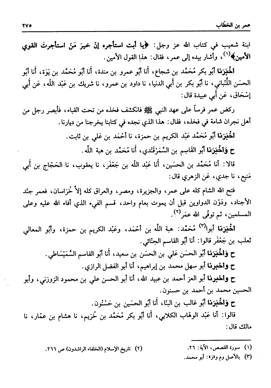 ابنة شعيب في كتاب الله عز وجل " يا أبت استأجره إن خير من استأجرت القوي الأمين " (1) وأشار بيده إلى عمر فقال هذا القول الأمين أخبرنا أبو بكر محمد بن شجاع أنا أبو عمرو بن مندة أنا أبو محمد بن يوة أنا أبو الحسن اللباني نا أبو بكر بن أبي الدنيا نا داود بن عمرو نا شريك بن عبد الله عن أبي إسحاق عن أبي عبيدة قال ركض عمر فرسا على عهد النبي (صلى الله عليه وسلم) فانكشف فخذه من تحت القباء فأبصر رجل من أهل نجران شامة في فخذه فقال هذا الذي نجده في كتابنا يخرجنا من ديارنا أخبرنا أبو محمد عبد الكريم بن حمزة نا أحمد بن علي بن ثابت ح وأخبرنا أبو القاسم بن السمرقندي أنا محمد بن هبة الله قالا أنا محمد بن الحسين أنا عبد الله بن جعفر نا يعقوب نا الحجاج بن أبي منيع نا جدي عن الزهري قال فتح الله الشام كله على عمر والجزيرة ومصر والعراق كله إلا خراسان فعمر جند الأجناد ودون الدواوين قبل أن يموت بعام واحد قسم الفئ الذي أفاء الله عليه وعلى المسلمين ثم توفى الله عمر (2) أخبرنا أبوا (3) محمد هبة الله بن أحمد وعبد الكريم بن حمزة وأبو المعالي ثعلب بن جعفر قالوا أنا أبو القاسم الحنائي ح وأخبرنا أبو الحسن علي بن الحسن بن سعيد أنا أبو القاسم السميساطي ح وأخبرنا أبو سهل محمد بن إبراهيم أنا أبو الفضل الرازي ح وأخبرنا أبو العز أحمد بن عبيد الله أنا أبو الحسن علي بن محمود الزوزني وأبو الحسين محمد بن أحمد بن حسنون ح وأخبرنا أبو غالب بن البنا أنا أبو الحسين بن حسنون قالوا أنا عبد الوهاب الكلابي أنا أبو بكر محمد بن خريم نا هشام بن عمار نا مالك قال