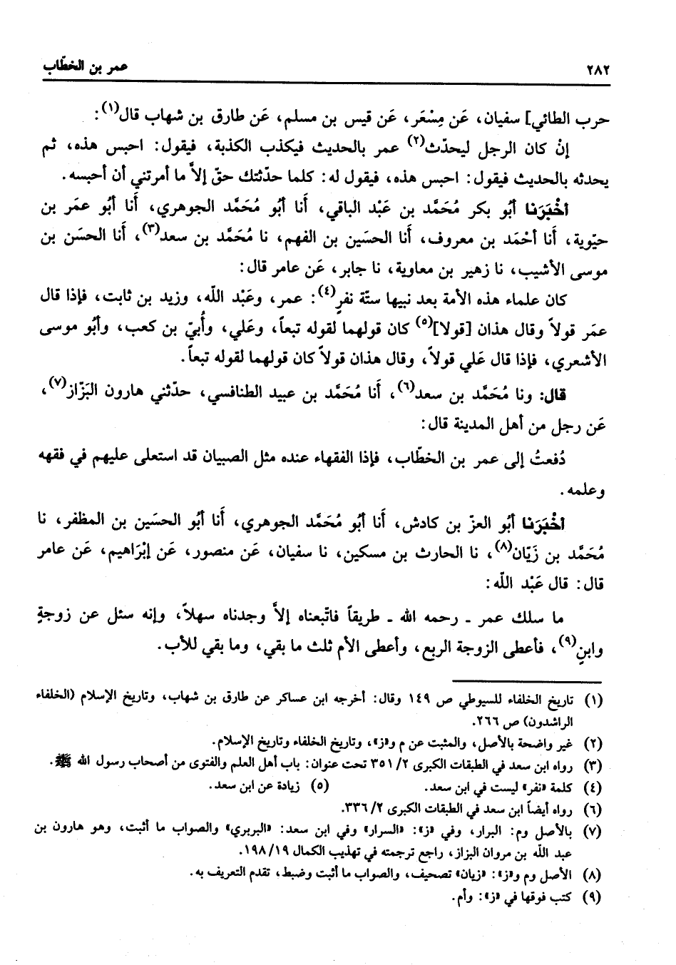 حرب الطائي سفيان عن مسعر عن قيس بن مسلم عن طارق بن شهاب قال (1) إن كان الرجل ليحدث (2) عمر بالحديث فيكذب الكذبة فيقول احبس هذه ثم يحدثه بالحديث فيقول احبس هذه فيقول له كلما حدثتك حق إلا ما أمرتني أن أحبسه أخبرنا أبو بكر محمد بن عبد الباقي أنا أبو محمد الجوهري أنا أبو عمر بن حيوية أنا أحمد بن معروف أنا الحسين بن الفهم نا محمد بن سعد (3) أنا الحسن بن موسى الأشيب نا زهير بن معاوية نا جابر عن عامر قال كان علماء هذه الأمة بعد نبيها ستة نفر (4) عمر وعبد الله وزيد بن ثابت فإذا قال عمر قولا وقال هذان قولا (5) كان قولهما لقوله تبعا وعلي وأبي بن كعب وأبو موسى الأشعري فإذا قال علي قولا وقال هذان قولا كان قولهما لقوله تبعا قال ونا محمد بن سعد (6) أنا محمد بن عبيد الطنافسي حدثني هارون البزاز (7) عن رجل من أهل المدينة قال دفعت إلى عمر بن الخطاب فإذا الفقهاء عنده مثل الصبيان قد استعلى عليهم في فقهه وعلمه أخبرنا أبو العز بن كادش أنا أبو محمد الجوهري أنا أبو الحسين بن المظفر نا محمد بن زيان (8) نا الحارث بن مسكين نا سفيان عن منصور عن إبراهيم عن عامر قال قال عبد الله ما سلك عمر رحمه الله طريقا فاتبعناه إلا وجدناه سهلا وإنه سئل عن زوجة وابن (9) فأعطى الزوجة الربع وأعطى الأم ثلث ما بقي وما بقي للأب