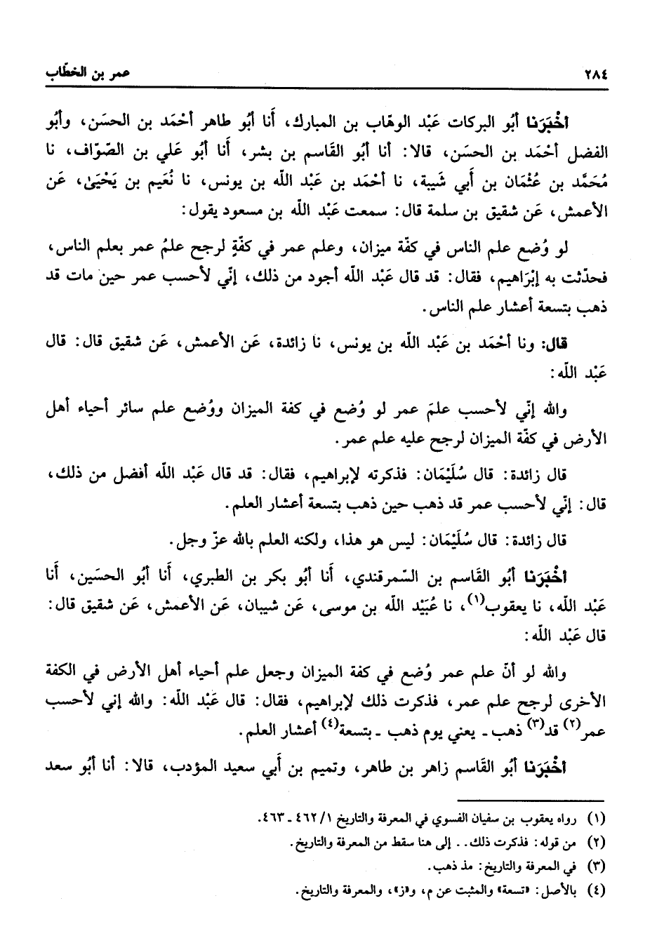 أخبرنا أبو البركات عبد الوهاب بن المبارك أنا أبو طاهر أحمد بن الحسن وأبو الفضل أحمد بن الحسن قالا أنا أبو القاسم بن بشر أنا أبو علي بن الصواف نا محمد بن عثمان بن أبي شيبة نا أحمد بن عبد الله بن يونس نا نعيم بن يحيى عن الأعمش عن شقيق بن سلمة قال سمعت عبد الله بن مسعود يقول لو وضع علم الناس في كفة ميزان وعلم عمر في كفة لرجح علم عمر بعلم الناس فحدثت به إبراهيم فقال قد قال عبد الله أجود من ذلك إني لأحسب عمر حين مات قد ذهب بتسعة أعشار علم الناس قال ونا أحمد بن عبد الله بن يونس نا زائدة عن الأعمش عن شقيق قال قال عبد الله والله إني لأحسب علم عمر لو وضع في كفة الميزان ووضع علم سائر أحياء أهل الأرض في كفة الميزان لرجح عليه علم عمر قال زائدة قال سليمان فذكرته لإبراهيم فقال قد قال عبد الله أفضل من ذلك قال إني لأحسب عمر قد ذهب حين ذهب بتسعة أعشار العلم قال زائدة قال سليمان ليس هو هذا ولكنه العلم بالله عز وجل أخبرنا أبو القاسم بن السمرقندي أنا أبو بكر بن الطبري أنا أبو الحسين أنا عبد الله نا يعقوب (1) نا عبيد الله بن موسى عن شيبان عن الأعمش عن شقيق قال قال عبد الله والله لو أن علم عمر وضع في كفة الميزان وجعل علم أحياء أهل الأرض في الكفة الأخرى لرجح علم عمر فذكرت ذلك لإبراهيم فقال قال عبد الله والله إني لأحسب عمر (2) قد (3) ذهب يعني يوم ذهب بتسعة (4) أعشار العلم أخبرنا أبو القاسم زاهر بن طاهر وتميم بن أبي سعيد المؤدب قالا أنا أبو سعد