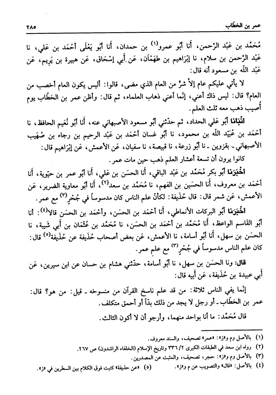 محمد بن عبد الرحمن أنا أبو عمرو (1) بن حمدان أنا أبو يعلى أحمد بن علي نا عبد الرحمن بن سلام نا إبراهيم بن طهمان عن أبي إسحاق عن هبيرة بن يريم عن عبد الله بن مسعود أنه قال لا يأتي عليكم عام إلا شر من العام الذي مضى قالوا أليس يكون العام أخصب من العام قال ليس ذاك أعني إنما أعني ذهاب العلماء ثم قال وأظن عمر بن الخطاب يوم أصيب ذهب معه ثلث العلم أنبأنا أبو علي الحداد ثم حدثني أبو مسعود الأصبهاني عنه أنا أبو نعيم الحافظ نا أحمد بن عبيد الله بن محمود نا أبو غسان أحمد بن عبد الرحيم بن رجاء بن صهيب الأصبهاني بقزوين نا أبو زرعة نا قبيصة نا سفيان عن الأعمش عن إبراهيم قال كانوا يرون أن تسعة أعشار العلم ذهب حين مات عمر أخبرنا أبو بكر محمد بن عبد الباقي أنا الحسن بن علي أنا أبو عمر بن حيوية أنا أحمد بن معروف أنا الحسين بن الفهم نا محمد بن سعد (2) أنا أبو معاوية الضرير عن الأعمش عن شمر قال قال حذيفة لكأن علم الناس كان مدسوسا في جحر (3) مع عمر أخبرنا أبو البركات الأنماطي أنا أحمد بن الحسن وأحمد بن الحسن قالا (4) أنا أبو القاسم الواعظ أنا محمد بن أحمد بن الحسن نا محمد بن عثمان بن أبي شيبة نا الحسن بن سهل أنا أبو أسامة نا الأعمش عن بعض أصحاب حذيفة عن حذيفة (5) قال كان علم الناس مدسوسا في جحر (3) مع علم عمر قال ونا الحسن بن سهل نا أبو أسامة حدثني هشام بن حسان عن ابن سيرين عن أبي عبيدة بن حذيفة عن أبيه قال إنما يفي الناس ثلاثة من قد علم ناسخ القرآن من منسوخه قيل من هو قال عمر بن الخطاب أو رجل لا يجد من ذلك بدا أو أحمق متكلف قال محمد ما أنا بواحد منهما وأرجو أن لا أكون الثالث