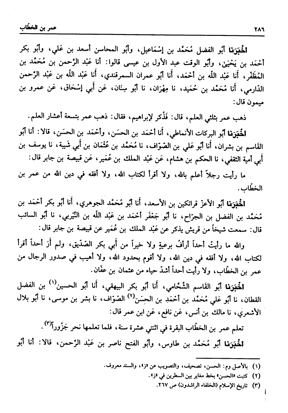 أخبرنا أبو الفضل محمد بن إسماعيل وأبو المحاسن أسعد بن علي وأبو بكر أحمد بن يحيى وأبو الوقت عبد الأول بن عيسى قالوا أنا عبد الرحمن بن محمد بن المظفر أنا عبد الله بن أحمد أنا أبو عمران السمرقندي أنا عبد الله بن عبد الرحمن الدارمي أنا محمد بن حميد نا مهران نا أبو سنان عن أبي إسحاق عن عمرو بن ميمون قال ذهب عمر بثلثي العلم قال فذكر لإبراهيم فقال ذهب عمر بتسعة أعشار العلم أخبرنا أبو البركات الأنماطي أنا أحمد بن الحسن وأحمد بن الحسن قالا أنا أبو القاسم بن بشران أنا أبو علي بن الصواف نا محمد بن عثمان بن أبي شيبة نا يوسف بن أبي أمية الثقفي نا الحكم بن هشام عن عبد الملك بن عمير عن قبيصة بن جابر قال ما رأيت رجلا أعلم بالله ولا أقرأ لكتاب الله ولا أفقه في دين الله من عمر بن الخطاب أخبرنا أبو الأعز قراتكين بن الأسعد أنا أبو محمد الجوهري أنا أبو بكر أحمد بن محمد بن الفضل بن الجراح نا أبو جعفر أحمد بن عبد الله بن النيربي نا أبو السائب قال سمعت شيخا من قريش يذكر عن عبد الملك بن عمير عن قبيصة بن جابر قال والله ما رأيت أحدا أرأف برعية ولا خيرا من أبي بكر الصديق ولم أر أحدا أقرأ لكتاب الله ولا أفقه في دين الله ولا أقوم بحدود الله ولا أهيب في صدور الرجال من عمر بن الخطاب ولا رأيت أحدا أشد حياء من عثمان بن عفان أخبرنا أبو القاسم الشحامي أنا أبو بكر البيهقي أنا أبو الحسين (1) بن الفضل القطان نا أبو علي محمد بن أحمد بن الحسن (2) الصواف نا بشر بن موسى نا أبو بلال الأشعري نا مالك بن أنس عن نافع عن ابن عمر قال تعلم عمر بن الخطاب البقرة في اثنتي عشرة سنة فلما تعلمها نحر جزورا (3) أخبرنا أبو محمد بن طاوس وأبو الفتح ناصر بن عبد الرحمن قالا أنا أبو