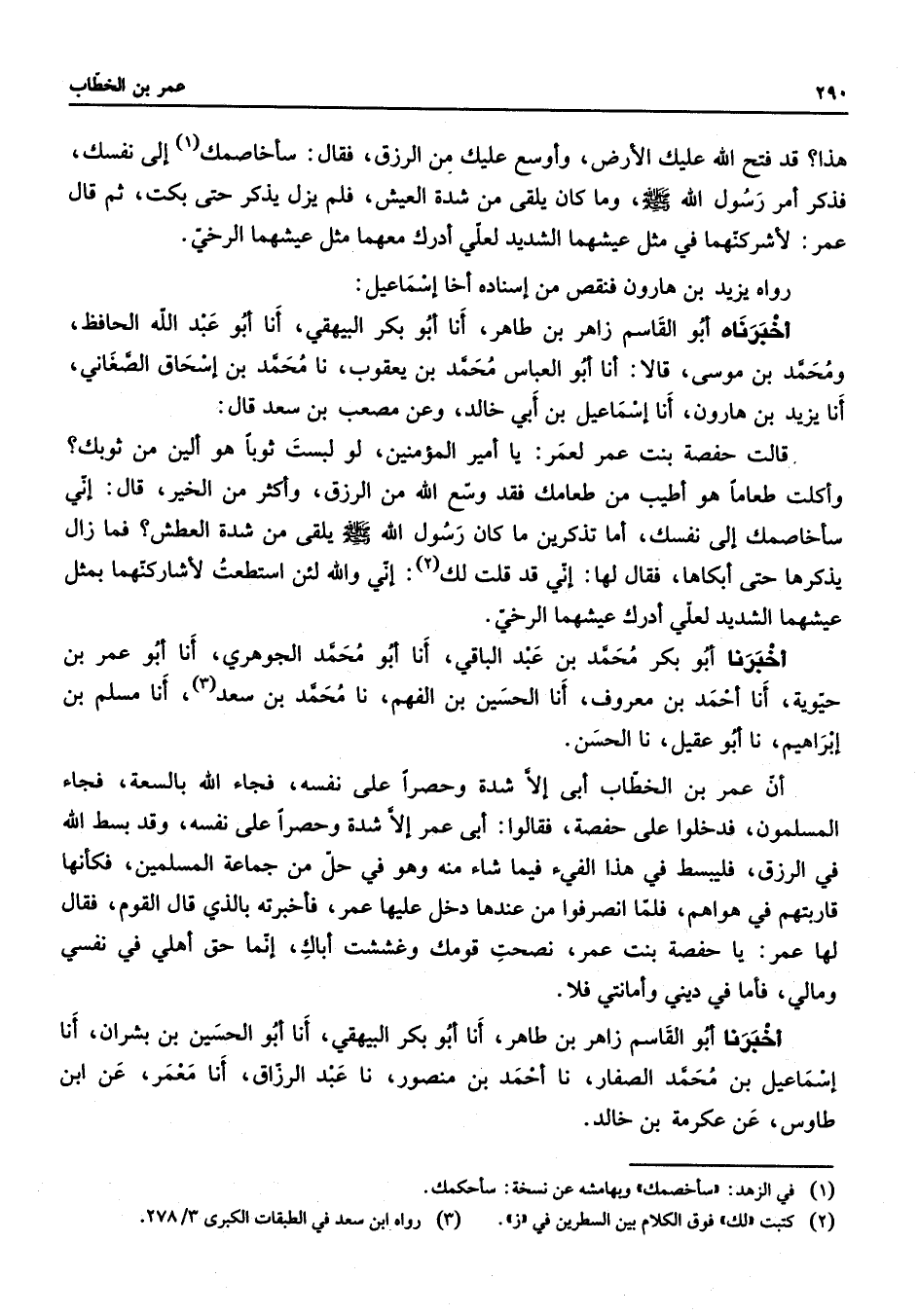 هذا قد فتح الله عليك الأرض وأوسع عليك من الرزق فقال سأخاصمك (1) إلى نفسك فذكر أمر رسول الله (صلى الله عليه وسلم) وما كان يلقى من شدة العيش فلم يزل يذكر حتى بكت ثم قال عمر لأشركنهما في مثل عيشهما الشديد لعلي أدرك معهما مثل عيشهما الرخي رواه يزيد بن هارون فنقص من إسناده أخا إسماعيل أخبرناه أبو القاسم زاهر بن طاهر أنا أبو بكر البيهقي أنا أبو عبد الله الحافظ ومحمد بن موسى قالا أنا أبو العباس محمد بن يعقوب نا محمد بن إسحاق الصغاني أنا يزيد بن هارون أنا إسماعيل بن أبي خالد وعن مصعب بن سعد قال قالت حفصة بنت عمر لعمر يا أمير المؤمنين لو لبست ثوبا هو ألين من ثوبك وأكلت طعاما هو أطيب من طعامك قد وسع الله من الرزق وأكثر من الخير قال إني سأخاصمك إلى نفسك أما تذكرين ما كان رسول الله (صلى الله عليه وسلم) يلقى من شدة العطش فما زال يذكرها حتى أبكاها فقال لها إني قد قلت لك (2) إني والله لئن استطعت لأشاركنهما بمثل عيشهما الشديد لعلي أدرك عيشهما الرخي أخبرنا أبو بكر محمد بن عبد الباقي أنا أبو محمد الجوهري أنا أبو عمر بن حيوية أنا أحمد بن معروف أنا الحسين بن الفهم نا محمد بن سعد (3) أنا مسلم بن إبراهيم نا أبو عقيل نا الحسن أن عمر بن الخطاب أبى إلا شدة وحصرا على نفسه فجاء الله بالسعة فجاء المسلمون فدخلوا على حفصة فقالوا أبى عمر إلا شدة وحصرا على نفسه وقد بسط الله في الرزق فليبسط في هذا الفئ فيما شاء منه وهو في حل من جماعة المسلمين فكأنها قاربتهم في هواهم فلما انصرفوا من عندها دخل عليها عمر فأخبرته بالذي قال القوم فقال لها عمر يا حفصة بنت عمر نصحت قومك وغششت أباك إنما حق أهلي في نفسي ومالي فأما في ديني وأمانتي فلا أخبرنا أبو القاسم زاهر بن طاهر أنا أبو بكر البيهقي أنا أبو الحسين بن بشران أنا إسماعيل بن محمد الصفار نا أحمد بن منصور نا عبد الرزاق أنا معمر عن ابن طاوس عن عكرمة بن خالد