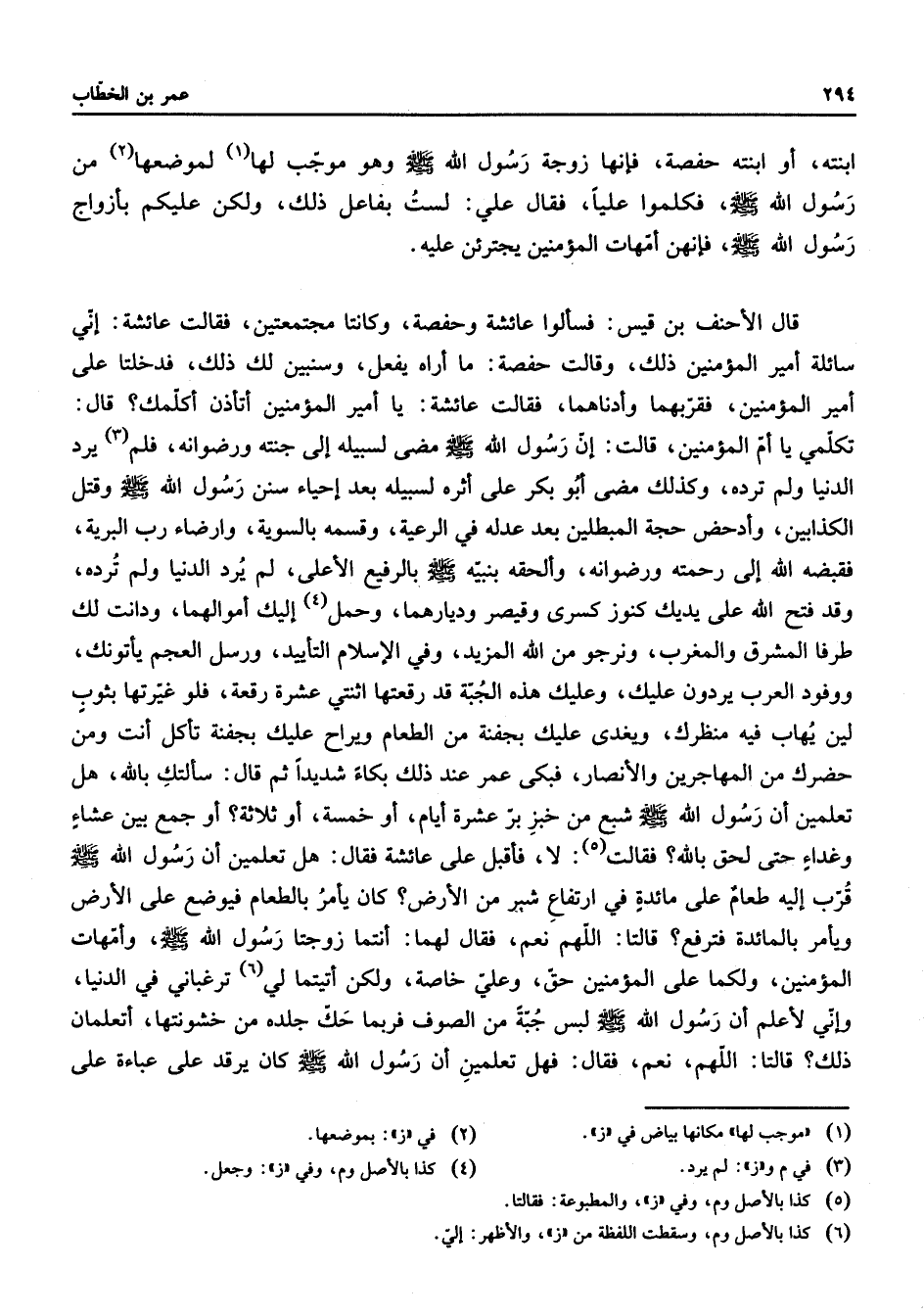 ابنته أو ابنته حفصة فإنها زوجة رسول الله (صلى الله عليه وسلم) وهو موجب لها (1) لموضعها (2) من رسول الله (صلى الله عليه وسلم) فكلموا عليا فقال علي لست بفاعل ذلك ولكن عليكم بأزواج رسول الله (صلى الله عليه وسلم) فإنهن أمهات المؤمنين يجترئن عليه قال الأحنف بن قيس فسألوا عائشة وحفصة وكانتا مجتمعتين فقالت عائشة إني سائلة أمير المؤمنين ذلك وقالت حفصة ما أراه يفعل وسنبين لك ذلك فدخلتا على أمير المؤمنين فقربهما وأدناهما فقالت عائشة يا أمير المؤمنين أتأذن أكلمك قال تكلمي يا أم المؤمنين قالت إن رسول الله (صلى الله عليه وسلم) مضى لسبيله إلى جنته ورضوانه فلم (3) يرد الدنيا ولم ترده وكذلك مضى أبو بكر على أثره لسبيله بعد إحياء سنن رسول الله (صلى الله عليه وسلم) وقتل الكذابين وأدحض حجة المبطلين بعد عدله في الرعية وقسمه بالسوية وارضاء رب البرية فقبضه الله إلى رحمته ورضوانه وألحقه بنبيه (صلى الله عليه وسلم) بالرفيع الأعلى لم يرد الدنيا ولم ترده وقد فتح الله على يديك كنوز كسرى وقيصر وديارهما وحمل (4) إليك أموالهما ودانت لك طرفا المشرق والمغرب ونرجو من الله المزيد وفي الإسلام التأييد ورسل العجم يأتونك ووفود العرب يردون عليك وعليك هذه الجبة قد رقعتها اثنتي عشرة رقعة فلو غيرتها بثوب لين يهاب فيه منظرك ويغدي عليك بجفنة من الطعام ويراح عليك بجفنة تأكل أنت ومن حضرك من المهاجرين والأنصار فبكى عمر عند ذلك بكاء شديدا ثم قال سألتك بالله هل تعلمين أن رسول الله (صلى الله عليه وسلم) شبع من خبز بر عشرة أيام أو خمسة أو ثلاثة أو جمع بين عشاء وغداء حتى لحق بالله فقالت (5) لا فأقبل على عائشة فقال هل تعلمين أن رسول الله (صلى الله عليه وسلم) قرب إليه طعام على مائدة في ارتفاع شبر من الأرض كان يأمر بالطعام فيوضع على الأرض ويأمر بالمائدة فترفع قالتا اللهم نعم فقال لهما أنتما زوجا رسول الله (صلى الله عليه وسلم) وأمهات المؤمنين ولكما على المؤمنين حق وعلي خاصة ولكن أتيتما لي (6) ترغباني في الدنيا وإني لأعلم أن رسول الله (صلى الله عليه وسلم) لبس جبة من الصوف فربما حك جلده من خشونتها أتعلمان ذلك قالتا اللهم نعم فقال فهل تعلمين أن رسول الله (صلى الله عليه وسلم) كان يرقد على عباءة على