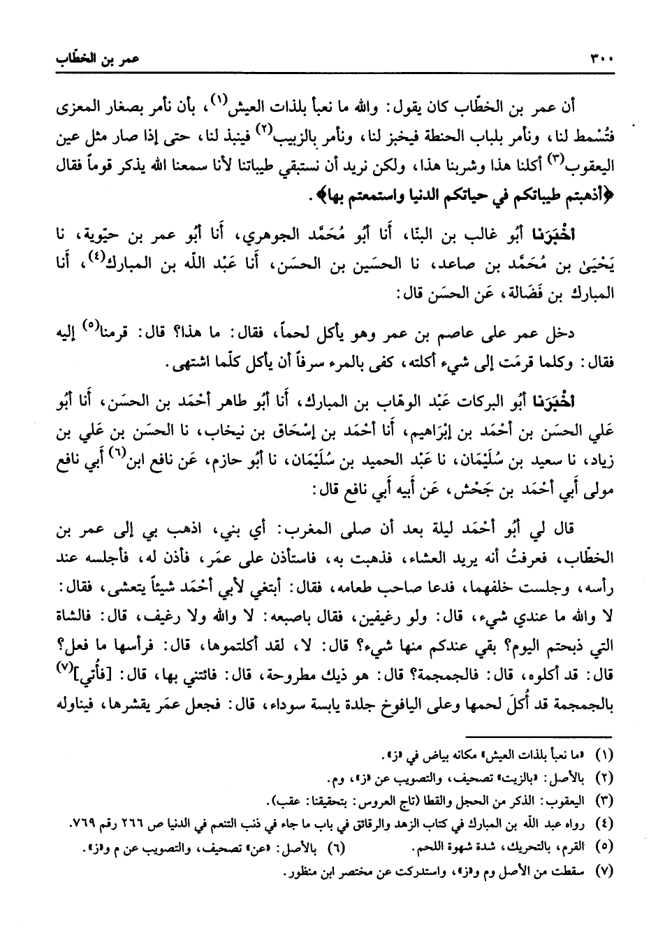 أن عمر بن الخطاب كان يقول والله ما نعبأ بلذات العيش (1) بأن نأمر بصغار المعزى فتسمط لنا ونأمر بلباب الحنطة فيخبز لنا ونأمر بالزبيب (2) فينبذ لنا حتى إذا صار مثل عين اليعقوب (3) أكلنا هذا وشربنا هذا ولكن نريد أن نستبقي طيباتنا لأنا سمعنا الله يذكر قوما فقال " أذهبتم طيباتكم في حياتكم الدنيا واستمعتم بها " أخبرنا أبو غالب بن البنا أنا أبو محمد الجوهري أنا أبو عمر بن حيوية نا يحيى بن محمد بن صاعد نا الحسين بن الحسن أنا عبد الله بن المبارك (4) أنا المبارك بن فضالة عن الحسن قال دخل عمر على عاصم بن عمر وهو يأكل لحما فقال ما هذا قال قرمنا (5) إليه فقال وكلما قرمت إلى شئ أكلته كفى بالمرء سرفا أن يأكل كلما اشتهى أخبرنا أبو البركات عبد الوهاب بن المبارك أنا أبو طاهر أحمد بن الحسن أنا أبو علي الحسن بن أحمد بن إبراهيم أنا أحمد بن إسحاق بن نيخاب نا الحسن بن علي بن زياد نا سعيد بن سليمان نا عبد الحميد بن سليمان نا أبو حازم عن نافع ابن (6) أبي نافع مولى أبي أحمد بن جحش عن أبيه أبي نافع قال قال لي أبو أحمد ليلة بعد أن صلى المغرب أي بني اذهب بي إلى عمر بن الخطاب فعرفت أنه يريد العشاء فذهبت به فاستأذن على عمر فأذن له فأجلسه عند رأسه وجلست خلفهما فدعا صاحب طعامه فقال أبتغي لأبي أحمد شيئا يتعشى فقال لا والله ما عندي شئ قال ولو رغيفين فقال باصبعه لا والله ولا رغيف قال فالشاة التي ذبحتم اليوم بقي عندكم منها شئ قال لا لقد أكلتموها قال فرأسها ما فعل قال قد أكلوه قال فالجمجمة قال هو ذيك مطروحة قال فائتني بها قال فأتي (7) بالجمجمة قد أكل لحمها وعلى اليافوخ جلدة يابسة سوداء قال فجعل عمر يقشرها فيناوله