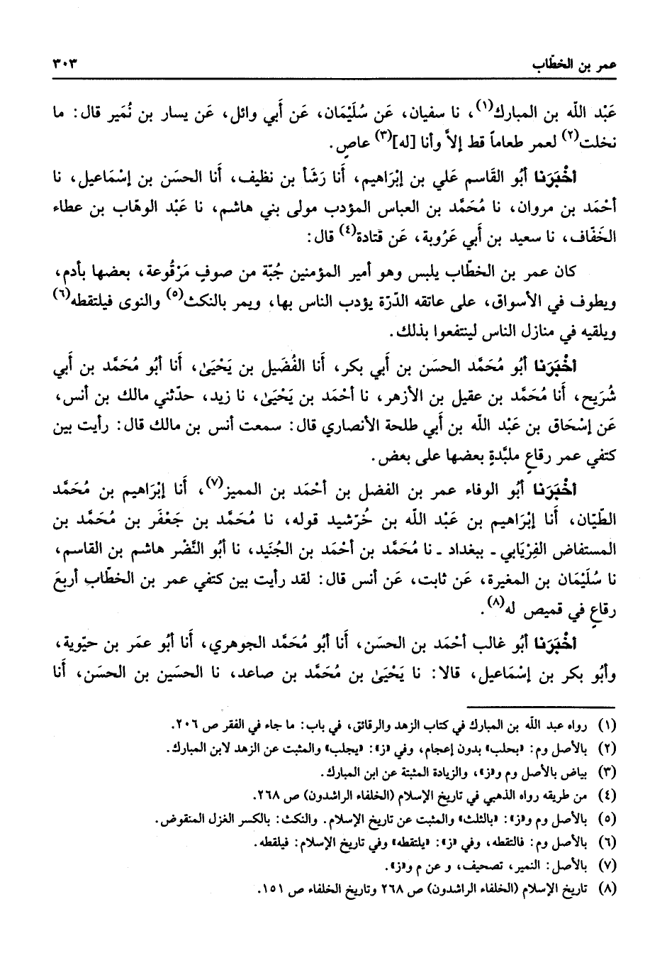 عبد الله بن المبارك (1) نا سفيان عن سليمان عن أبي وائل عن يسار بن نمير قال ما نخلت (2) لعمر طعاما قط إلا وأنا له (3) عاص أخبرنا أبو القاسم علي بن إبراهيم أنا رشأ بن نظيف أنا الحسن بن إسماعيل نا أحمد بن مروان نا محمد بن العباس المؤدب مولى بني هاشم نا عبد الوهاب بن عطاء الخفاف نا سعيد بن أبي عروبة عن قتادة (4) قال كان عمر بن الخطاب يلبس وهو أمير المؤمنين جبة من صوف مرقوعة بعضها بأدم ويطوف في الأسواق على عاتقه الدرة يؤدب الناس بها ويمر بالنكث (5) والنوى فيلتقطه (6) ويلقيه في منازل الناس لينتفعوا بذلك أخبرنا أبو محمد الحسن بن أبي بكر أنا الفضيل بن يحيى أنا أبو محمد بن أبي شريح أنا محمد بن عقيل بن الأزهر نا أحمد بن يحيى نا زيد حدثني مالك بن أنس عن إسحاق بن عبد الله بن أبي طلحة الأنصاري قال سمعت أنس بن مالك قال رأيت بين كتفي عمر رقاع ملبدة بعضها على بعض أخبرنا أبو الوفاء عمر بن الفضل بن أحمد بن المميز (7) أنا إبراهيم بن محمد الطيان أنا إبراهيم بن عبد الله بن خرشيد قوله نا محمد بن جعفر بن محمد بن المستفاض الفريابي ببغداد نا محمد بن أحمد بن الجنيد نا أبو النضر هاشم بن القاسم نا سليمان بن المغيرة عن ثابت عن أنس قال لقد رأيت بين كتفي عمر بن الخطاب أربع رقاع في قميص له (8) أخبرنا أبو غالب أحمد بن الحسن أنا أبو محمد الجوهري أنا أبو عمر بن حيوية وأبو بكر بن إسماعيل قالا نا يحيى بن محمد بن صاعد نا الحسين بن الحسن أنا