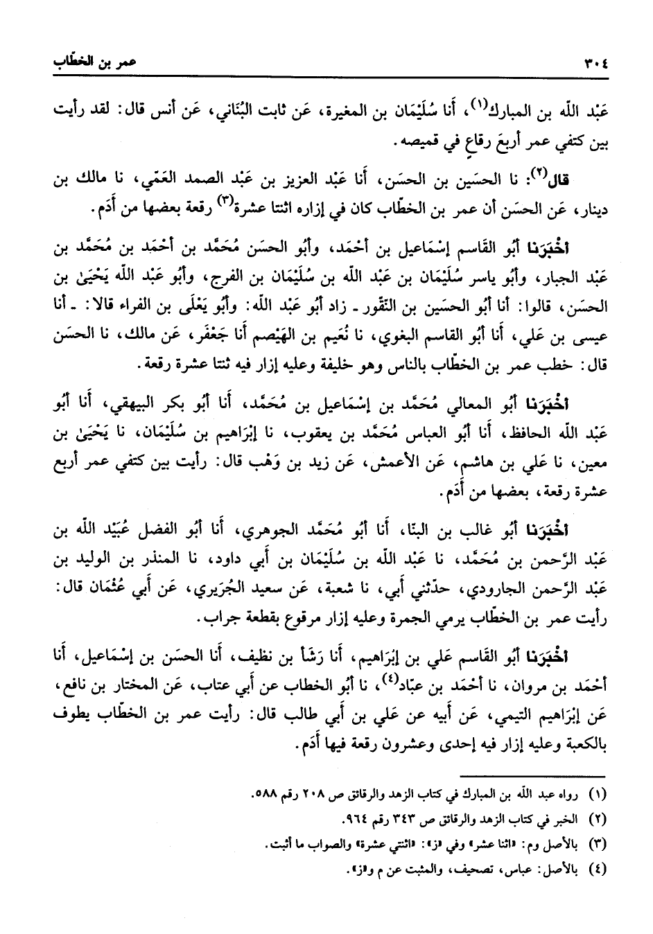 عبد الله بن المبارك (1) أنا سليمان بن المغيرة عن ثابت البناني عن أنس قال لقد رأيت بين كتفي عمر أربع رقاع في قميصه قال (2) نا الحسين بن الحسن أنا عبد العزيز بن عبد الصمد العمي نا مالك بن دينار عن الحسن أن عمر بن الخطاب كان في إزاره اثنتا عشرة رقعة بعضها من أدم أخبرنا أبو القاسم إسماعيل بن أحمد وأبو الحسن محمد بن أحمد بن محمد بن عبد الجبار وأبو ياسر سليمان بن عبد الله بن سليمان بن الفرج وأبو عبد الله يحيى بن الحسن قالوا أنا أبو الحسين بن النقور زاد أبو عبد الله وأبو يعلى بن الفراء قالا أنا عيسى بن علي أنا أبو القاسم البغوي نا نعيم بن الهيصم أنا جعفر عن مالك نا الحسن قال خطب عمر بن الخطاب بالناس وهو خليفة وعليه إزار فيه ثنتا عشرة رقعة أخبرنا أبو المعالي محمد بن إسماعيل بن محمد أنا أبو بكر البيهقي أنا أبو عبد الله الحافظ أنا أبو العباس محمد بن يعقوب نا إبراهيم بن سليمان نا يحيى بن معين نا علي بن هاشم عن الأعمش عن زيد بن وهب قال رأيت بين كتفي عمر أربع عشرة رقعة بعضها من أدم أخبرنا أبو غالب بن البنا أنا أبو محمد الجوهري أنا أبو الفضل عبيد الله بن عبد الرحمن بن محمد نا عبد الله بن سليمان بن أبي داود نا المنذر بن الوليد بن عبد الرحمن الجارودي حدثني أبي نا شعبة عن سعيد الجريري عن أبي عثمان قال رأيت عمر بن الخطاب يرمي الجمرة وعليه إزار مرقوع بقطعة جراب أخبرنا أبو القاسم علي بن إبراهيم أنا رشأ بن نظيف أنا الحسن بن إسماعيل أنا أحمد بن مروان نا أحمد بن عباد (4) نا أبو الخطاب عن أبي عتاب عن المختار بن نافع عن إبراهيم التيمي عن أبيه عن علي بن أبي طالب قال رأيت عمر بن الخطاب يطوف بالكعبة وعليه إزار فيه إحدى وعشرون رقعة فيها أدم