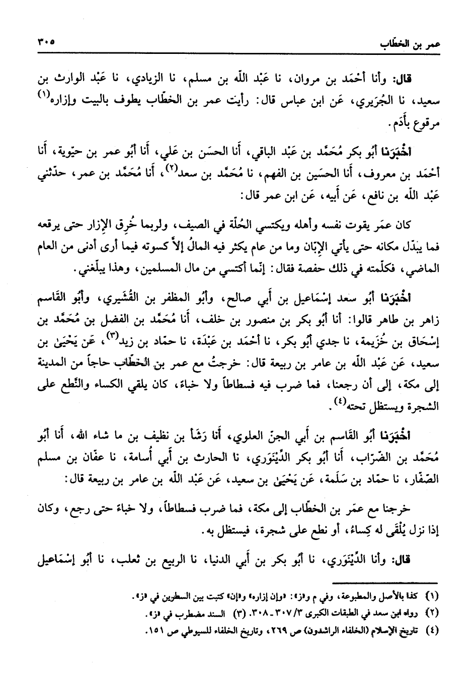 قال وأنا أحمد بن مروان نا عبد الله بن مسلم نا الزيادي نا عبد الوارث بن سعيد نا الجريري عن ابن عباس قال رأيت عمر بن الخطاب يطوف بالبيت وإزاره (1) مرقوع بأدم أخبرنا أبو بكر محمد بن عبد الباقي أنا الحسن بن علي أنا أبو عمر بن حيوية أنا أحمد بن معروف أنا الحسين بن الفهم نا محمد بن سعد (2) أنا محمد بن عمر حدثني عبد الله بن نافع عن أبيه عن ابن عمر قال كان عمر يقوت نفسه وأهله ويكتسي الحلة في الصيف ولربما خرق الإزار حتى يرقعه فما يبدل مكانه حتى يأتي الإبان وما من عام يكثر فيه المال إلا كسوته فيما أرى أدنى من العام الماضي فكلمته في ذلك حفصة فقال إنما أكتسي من مال المسلمين وهذا يبلغني أخبرنا أبو سعد إسماعيل بن أبي صالح وأبو المظفر بن القشيري وأبو القاسم زاهر بن طاهر قالوا أنا أبو بكر بن منصور بن خلف أنا محمد بن الفضل بن محمد بن إسحاق بن خزيمة نا جدي أبو بكر نا أحمد بن عبدة نا حماد بن زيد (3) عن يحيى بن سعيد عن عبد الله بن عامر بن ربيعة قال خرجت مع عمر بن الخطاب حاجا من المدينة إلى مكة إلى أن رجعنا فما ضرب فيه فسطاطا ولا خباء كان يلقي الكساء والنطع على الشجرة ويستظل تحته (4) أخبرنا أبو القاسم بن أبي الجن العلوي أنا رشأ بن نظيف بن ما شاء الله أنا أبو محمد بن الضراب أنا أبو بكر الدينوري نا الحارث بن أبي أسامة نا عفان بن مسلم الصفار نا حماد بن سلمة عن يحيى بن سعيد عن عبد الله بن عامر بن ربيعة قال خرجنا مع عمر بن الخطاب إلى مكة فما ضرب فسطاطا ولا خباء حتى رجع وكان إذا نزل يلقى له كساء أو نطع على شجرة فيستظل به قال وأنا الدينوري نا أبو بكر بن أبي الدنيا نا الربيع بن ثعلب نا أبو إسماعيل